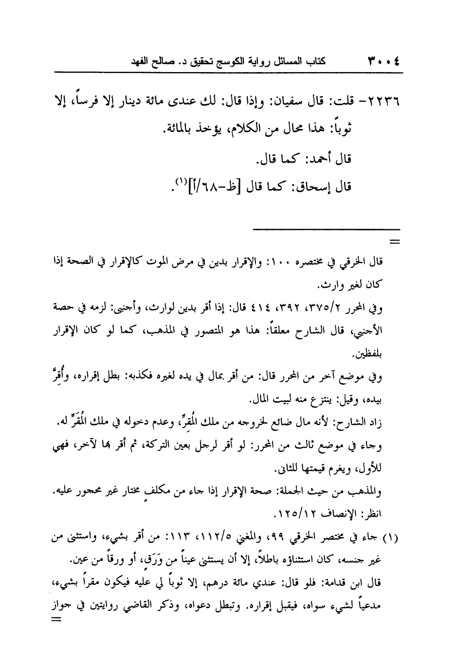 [2236-] قلت: قال سفيان: وإذا قال: لك عندى مائة دينار إلا فرساً، إلا ثوباً: هذا محال من الكلام، يؤخذ بالمائة.