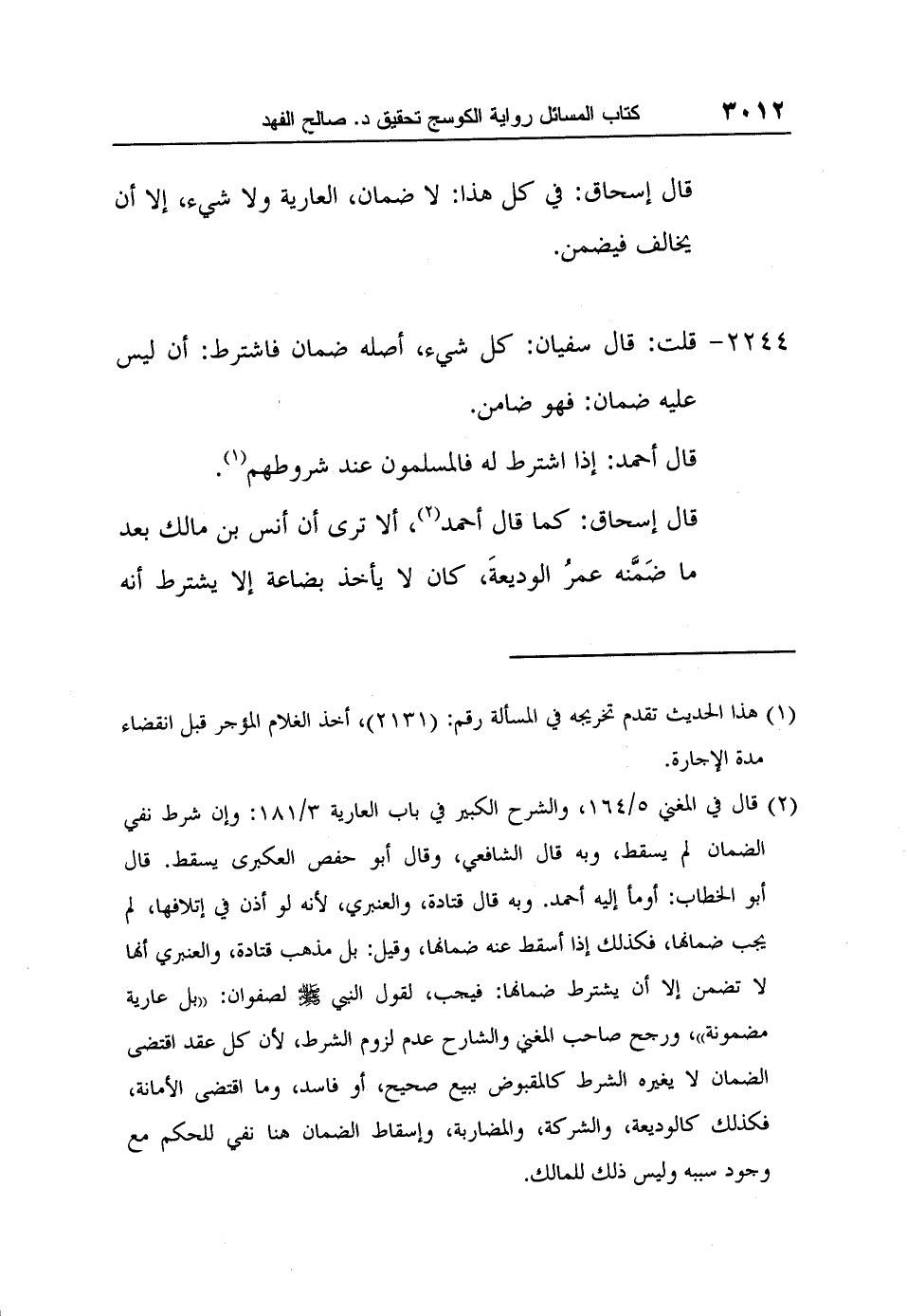 قال إسحاق: كما قال أحمد2، ألا ترى أن أنس بن مالك بعد ما ضَمَّنه عمرُ الوديعةَ، كان لا يأخذ بضاعة إلا يشترط أنه