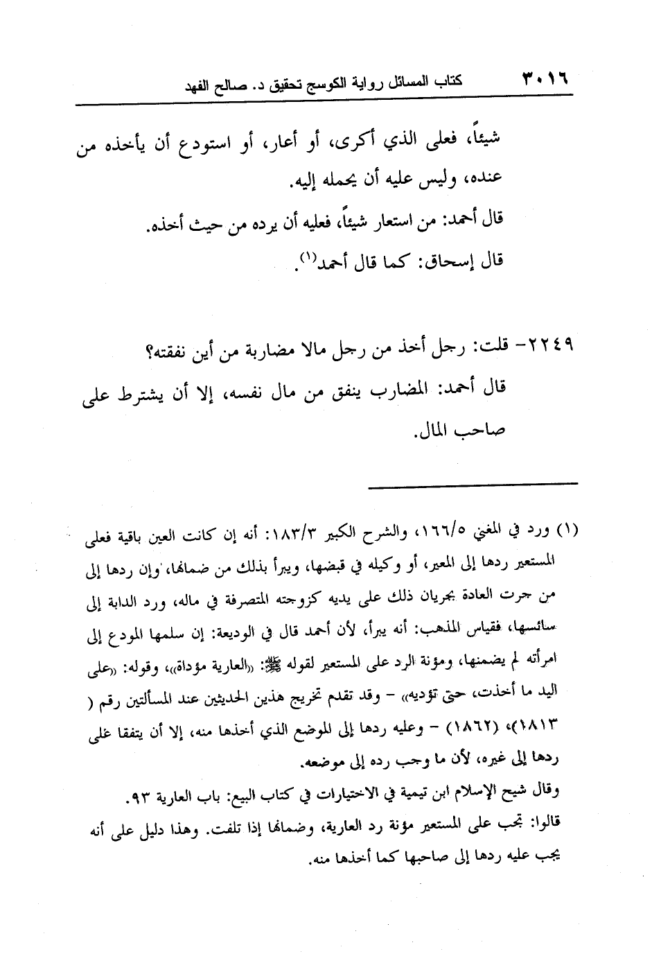1 ورد في المغني 5/166، والشرح الكبير 3/183: أنه إن كانت العين باقية فعلى المستعير ردها إلى المعير، أو وكيله في قبضها، ويبرأ بذلك من ضمانها، وإن ردها إلى من جرت العادة بجريان ذلك على يديه كزوجته المتصرفة في ماله، ورد الدابة إلى سائسها، فقياس المذهب: أنه يبرأ، لأن أحمد قال في الوديعة: إن سلمها المودع إلى امرأته لم يضمنها، ومؤنة الرد على المستعير لقوله صلى الله عليه وسلم: "العارية مؤداة"، وقوله: "على اليد ما أخذت، حتى تؤديه" - وقد تقدم تخريج هذين الحديثين عند المسألتين رقم (1813) ، (1862) - وعليه ردها إلى الموضع الذي أخذها منه، إلا أن يتفقا على ردها إلى غيره، لأن ما وجب رده إلى موضعه.