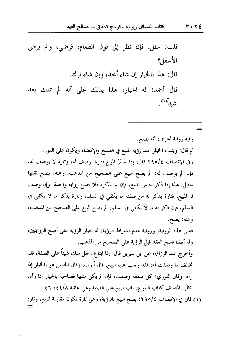 1 قال في الإنصاف 4/295: يصح البيع بالرؤية، وهي تارة تكون مقارنة للبيع، وتارة تكون غير مقارنة، فإن كانت مقارنة لجميعه: صح البيع بلا نزاع، وإن كانت مقارنة لبعضه، فإن دلت على بقيته: صح البيع نص عليه، فرؤية أحد وجهي ثوب: تكفي فيه إذا كان غير منقوش، وكذا رؤية وجه الرقيق، وظاهر الصبرة المتساوية الأجزاء من حب وثمر ونحوها.