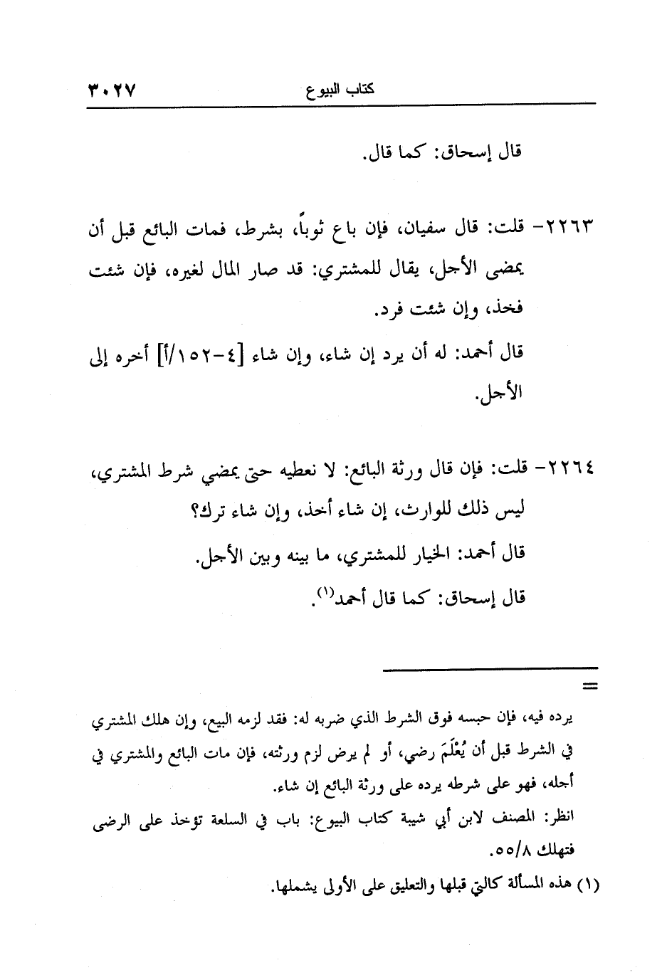 [2263-] قلت: قال سفيان، فإن باع ثوباً، بشرط، فمات البائع قبل أن يمضى الأجل، يقال للمشتري: قد صار المال لغيره، فإن شئت فخذ، وإن شئت فرد.