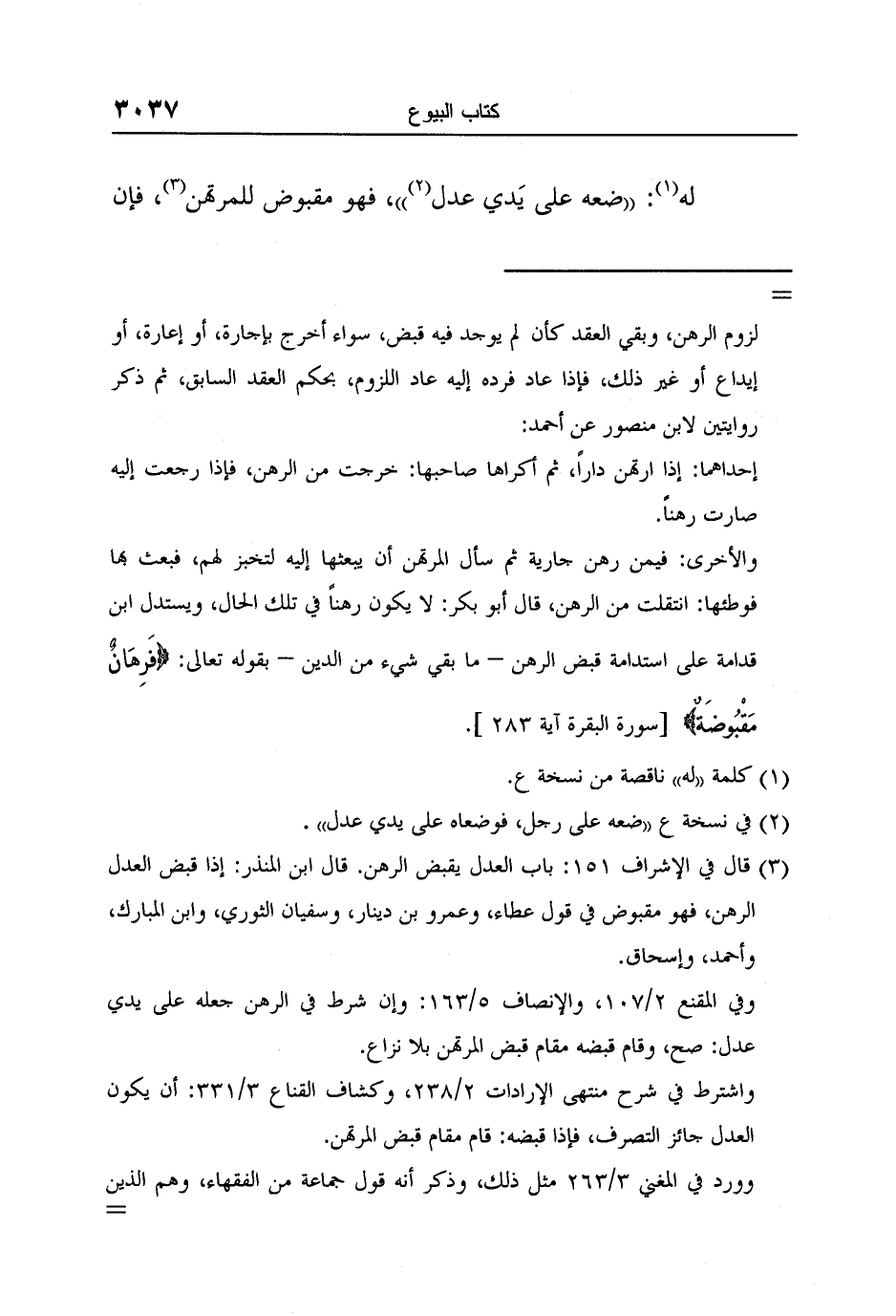 3 قال في الإشراف 151: باب العدل يقبض الرهن. قال ابن المنذر: إذا قبض العدل الرهن، فهو مقبوض في قول عطاء، وعمرو بن دينار، وسفيان الثوري، وابن المبارك، وأحمد، وإسحاق.