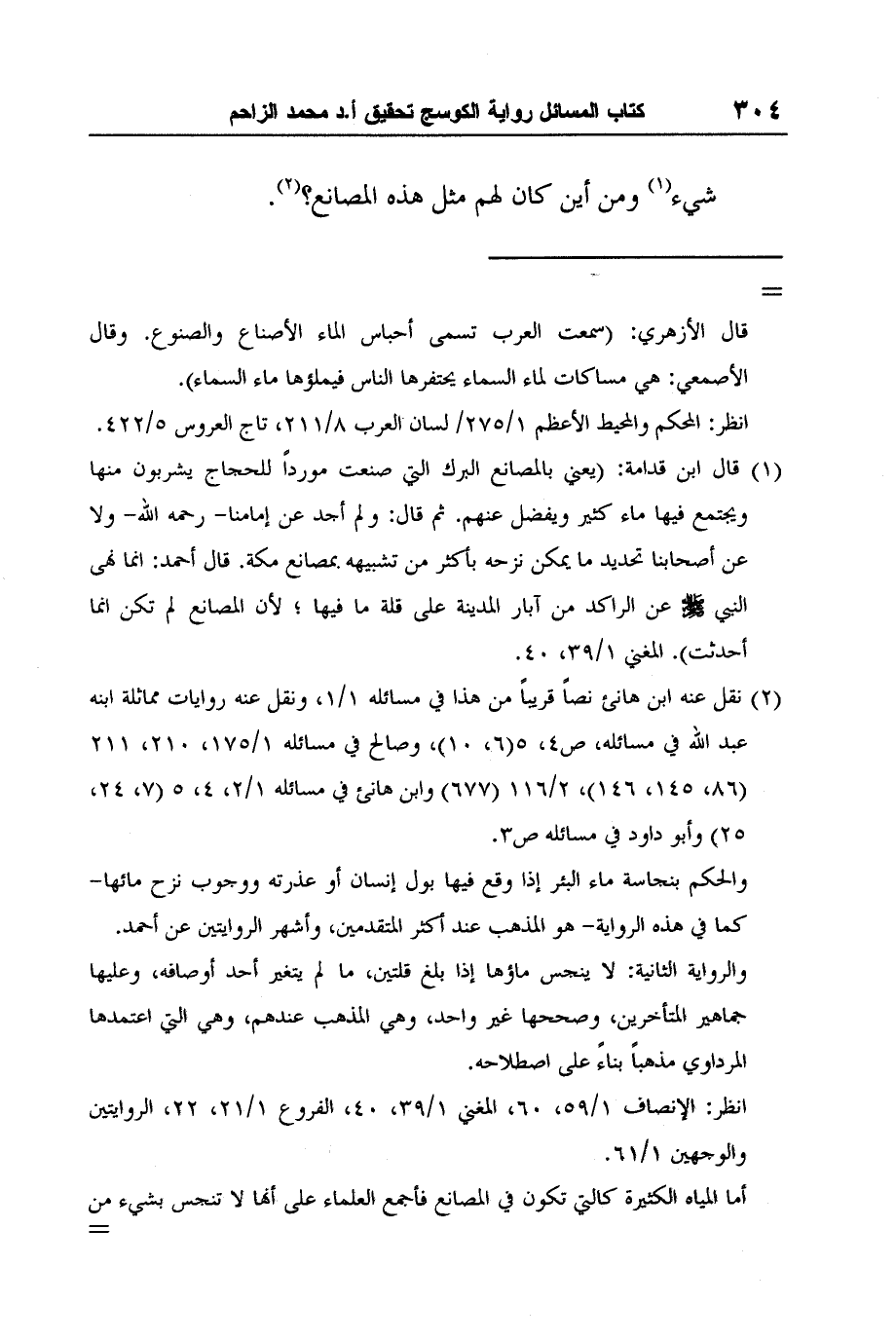 1 قال ابن قدامة: (يعني بالمصانع البرك التي صنعت مورداً للحجاج يشربون منها ويجتمع فيها ماء كثير ويفضل عنهم. ثم قال: ولم أجد عن إمامنا- رحمه الله- ولا عن أصحابنا تحديد ما يمكن نزحه بأكثر من تشبيهه بمصانع مكة. قال أحمد: انما نهى النبي صلى الله عليه وسلم عن الراكد من آبار المدينة على قلة ما فيها؛ لأن المصانع لم تكن انما أحدثت) . المغني 1/39، 40.