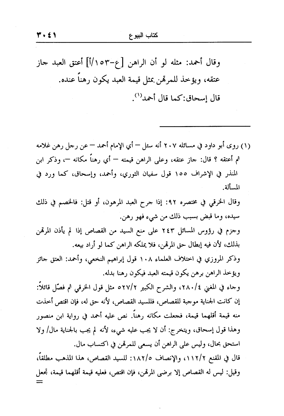 1 روى أبو داود في مسائله 207 أنه سئل – أي الإمام أحمد – عن رجل رهن غلامه ثم أعتقه؟ قال: جاز عتقه، وعلى الراهن قيمته – أي رهناً مكانه –، وذكر ابن المنذر في الإشراف 155 قول سفيان الثوري، وأحمد، وإسحاق، كما ورد في المسألة.