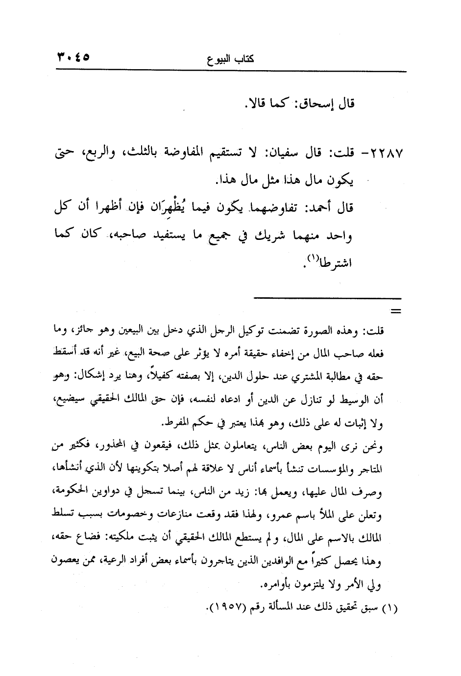[2287-] قلت: قال سفيان: لا تستقيم المفاوضة بالثلث، والربع، حتى يكون مال هذا مثل مال هذا.