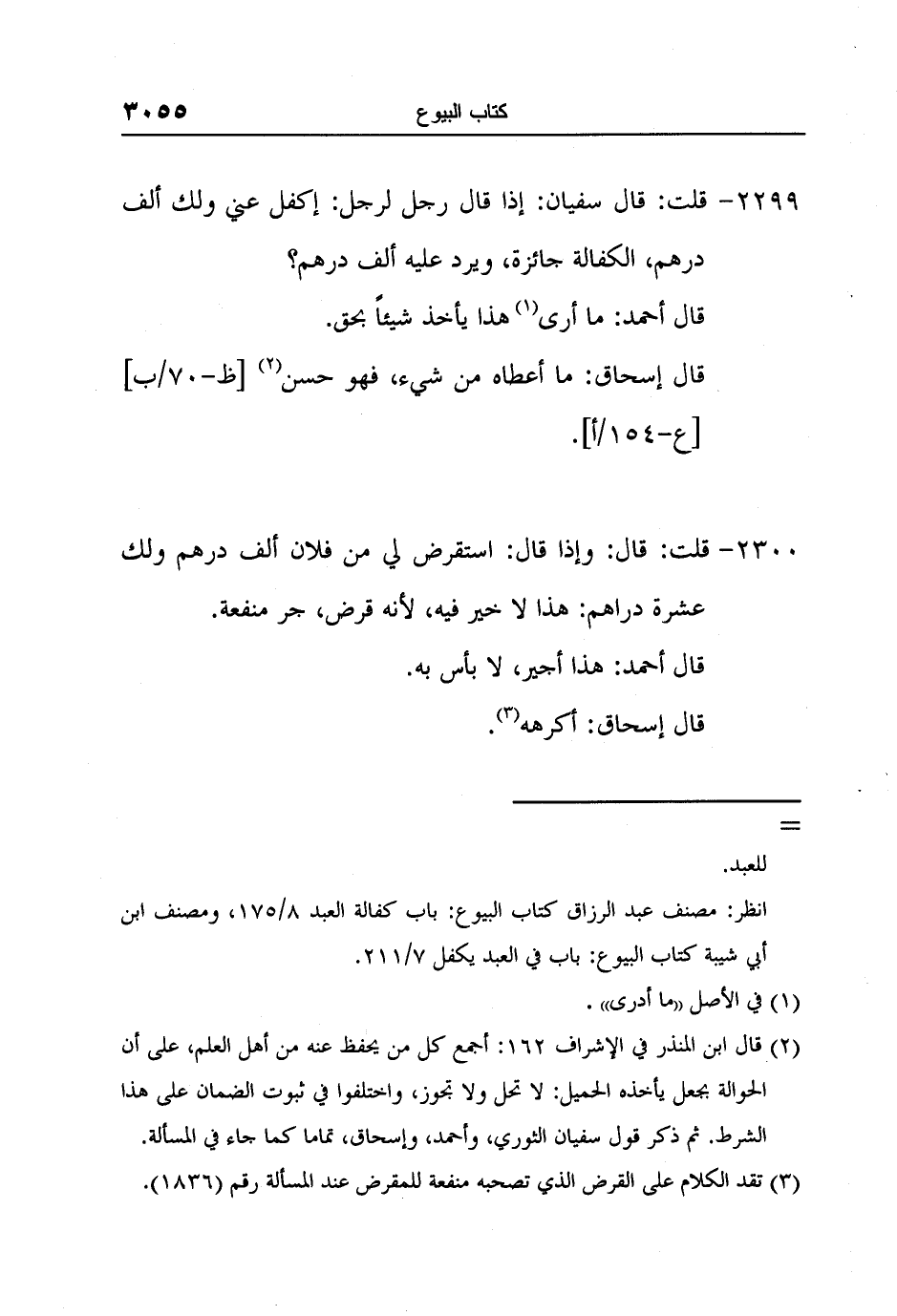 2 قال ابن المنذر في الإشراف 162: أجمع كل من يحفظ عنه من أهل العلم، على أن الحوالة بجعل يأخذه الحميل: لا تحل ولا تجوز، واختلفوا في ثبوت الضمان على هذا الشرط. ثم ذكر قول سفيان الثوري، وأحمد، وإسحاق، تماما كما جاء في المسألة.