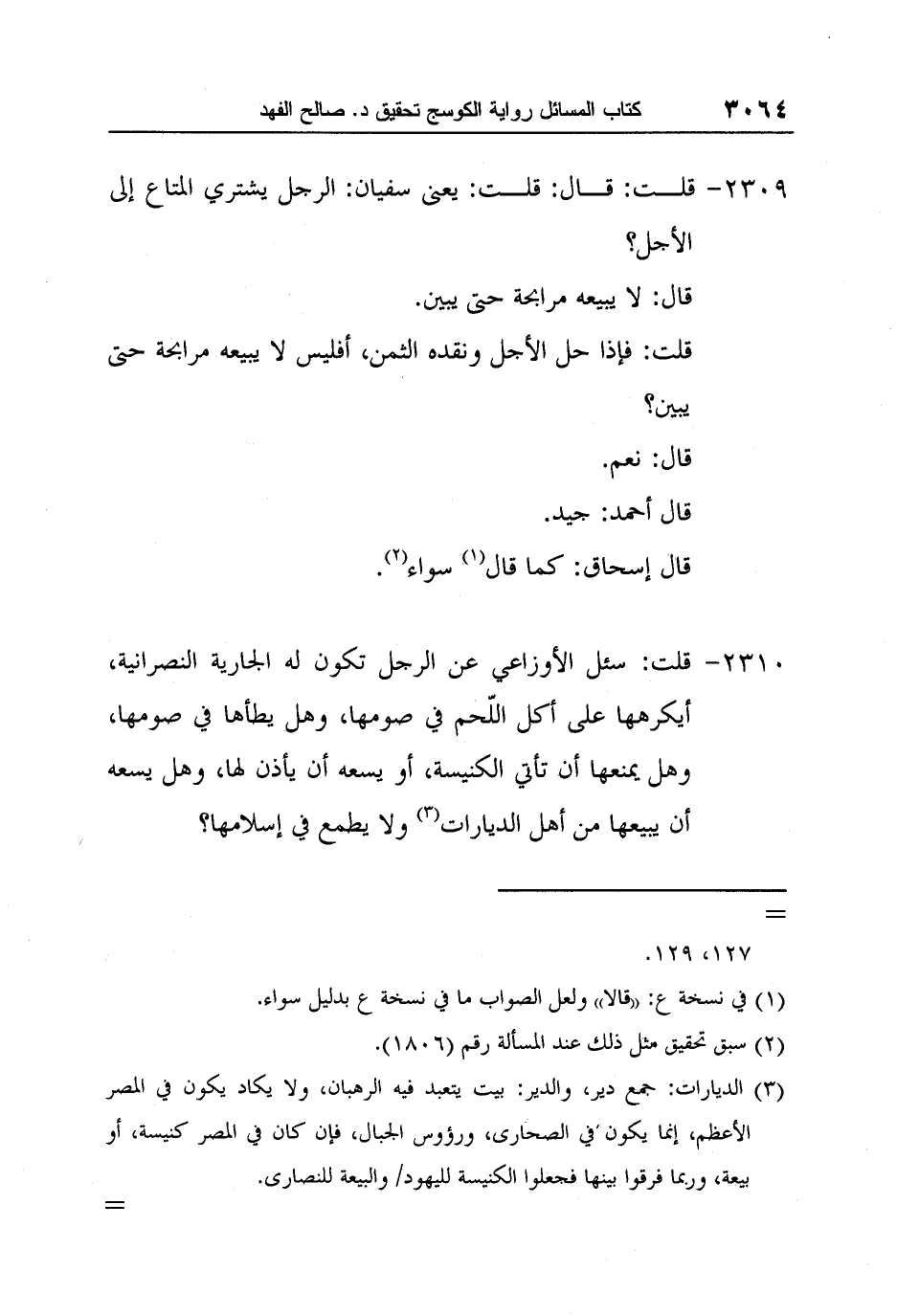 [2310-] قلت: سئل الأوزاعي عن الرجل تكون له الجارية النصرانية، أيكرهها على أكل اللّحم في صومها، وهل يطأها في صومها، وهل يمنعها أن تأتي الكنيسة، أو يسعه أن يأذن لها، وهل يسعه أن يبيعها من أهل الديارات3 ولا يطمع في إسلامها؟