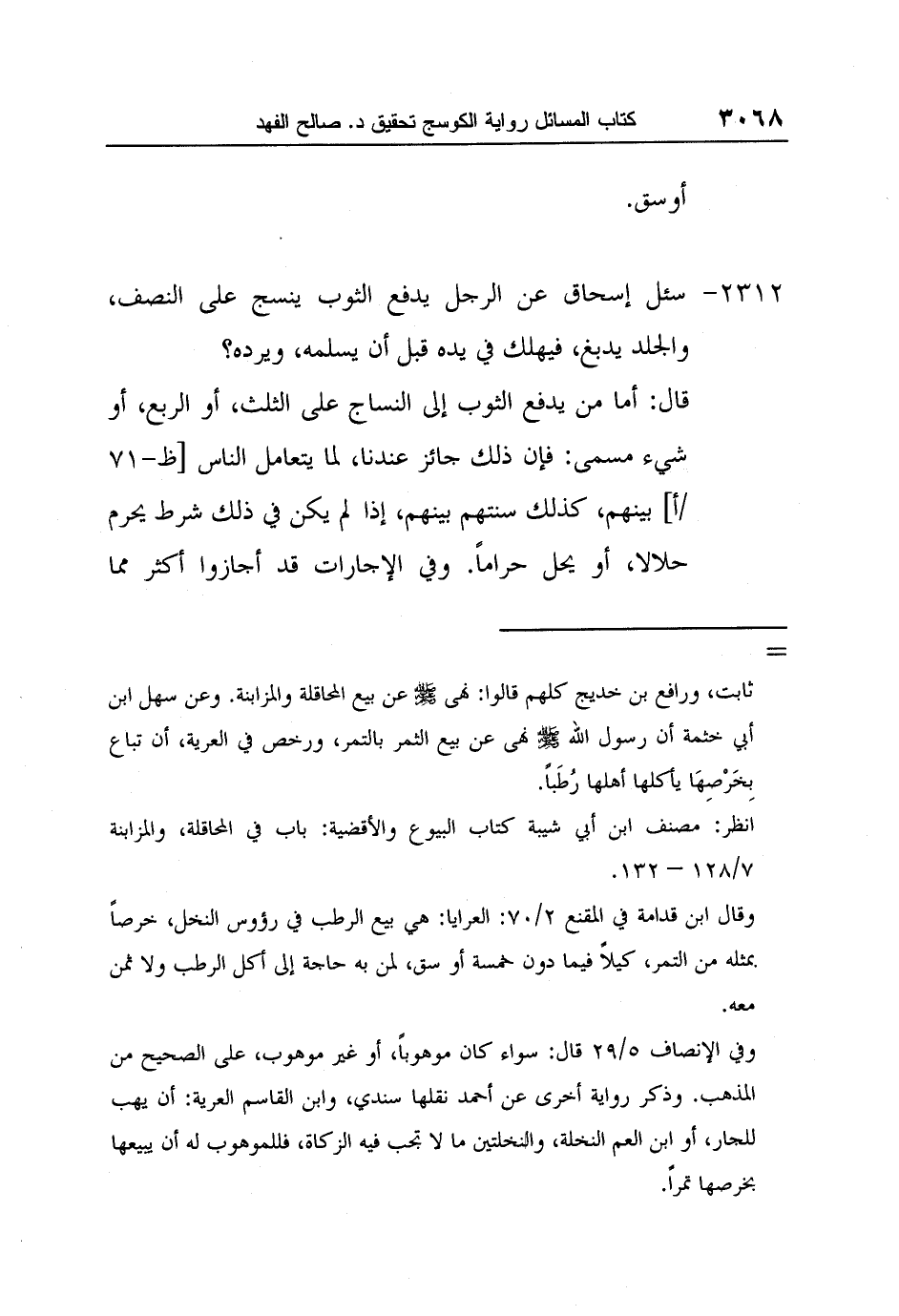 [2312-] سئل إسحاق عن الرجل يدفع الثوب ينسج على النصف، والجلد يدبغ، فيهلك في يده قبل أن يسلمه، ويرده؟