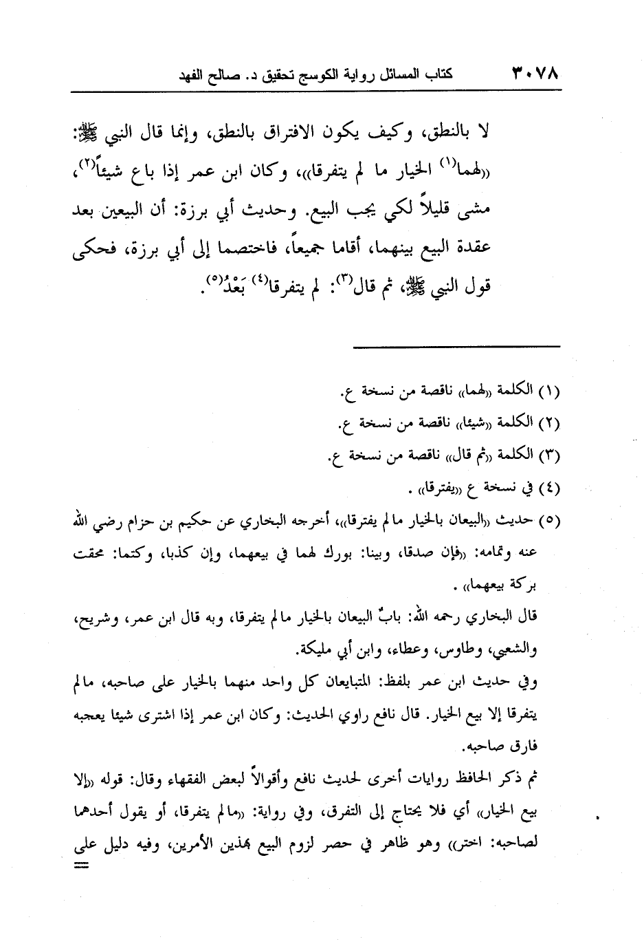 لا بالنطق، وكيف يكون الافتراق بالنطق، وإنما قال النبي صلى الله عليه وسلم: "لهما1 الخيار ما لم يتفرقا"، وكان ابن عمر إذا باع شيئاً2، مشى قليلاً لكي يجب البيع. وحديث أبي برزة: أن البيعين بعد عقدة البيع بينهما، أقاما جميعاً، فاختصما إلى أبي برزة، فحكى قول النبي صلى الله عليه وسلم، ثم قال3: لم يتفرقا4 بَعْدُ5.