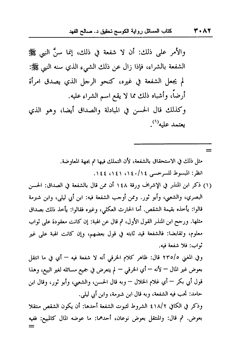 وفي المغني 5/235 قال: ظاهر كلام الخرقي أنه لا شفعة فيه – أي في ما انتقل بعوض غير المال – لأنه – أي الخرقي – لم يتعرض في جميع مسائله لغير البيع، وهذا قول أبي بكر – أي غلام الخلال – وبه قال الحسن، والشعبي، وأبو ثور، وقال ابن حامد: تجب فيه الشفعة، وبه قال ابن شبرمة، وابن أبي ليلى.