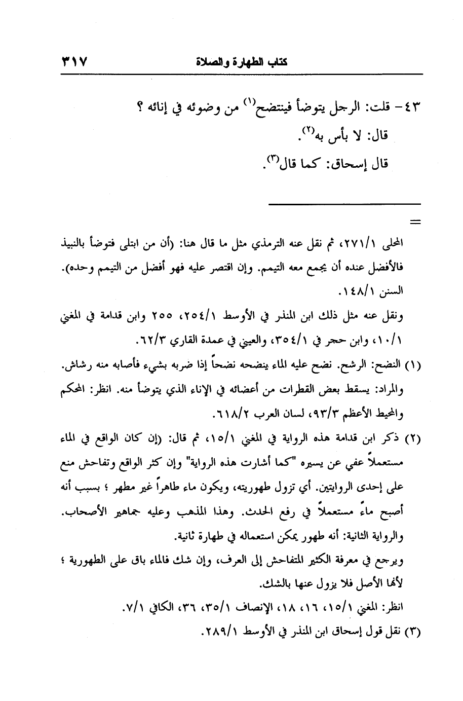 [43-] قلت: الرجل يتوضأ فينتضح1 من وضوئه في إنائه؟