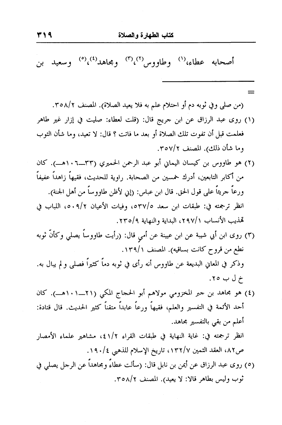 3 روى ابن أبي شيبة عن ابن عيينة عن أميٍ قال: (رأيت طاووساً يصلي وكأنّ ثوبه نطع من قروح كانت بساقيه) . المصنف 1/139.