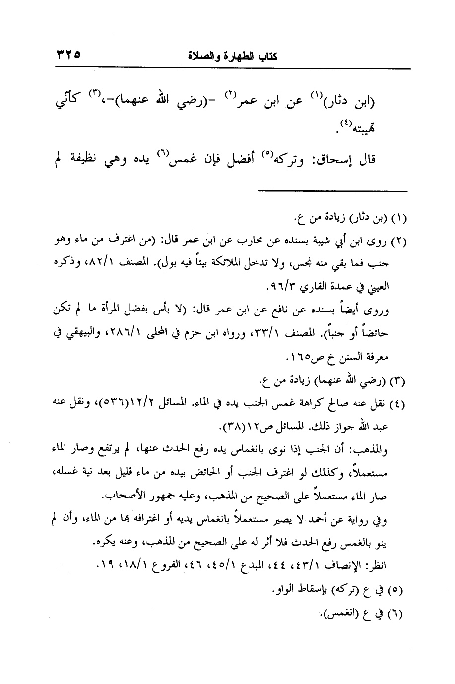 2 روى ابن أبي شيبة بسنده عن محارب عن ابن عمر قال: (من اغترف من ماء وهو جنب فما بقي منه نجس، ولا تدخل الملائكة بيتاً فيه بول) . المصنف 1/82، وذكره العيني في عمدة القاري 3/96.