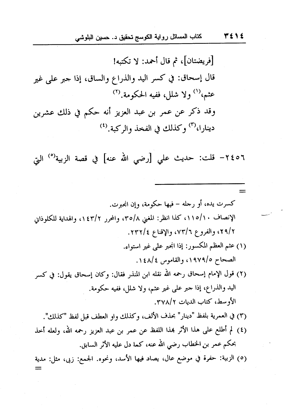 2 قول الإمام إسحاق رحمه الله نقله ابن المنذر فقال: وكان إسحاق يقول: في كسر اليد والذراع، إذا جبر على غير عثم، ولا شلل، ففيه حكومة.
