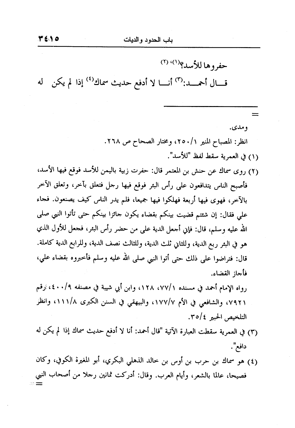 2 روى سماك عن حنش بن المعتمر قال: حفرت زبية باليمن للأسد فوقع فيها الأسد، فأصبح الناس يتدافعون على رأس البئر فوقع فيها رجل فتعلّق بآخر، وتعلّق الآخر بالآخر، فهوى فيها أربعة فهلكوا فيها جميعاً، فلم يدر الناس كيف يصنعون. فجاء علي فقال: إن شئتم قضيت بينكم بقضاء يكون جائزاً بينكم حتّى تأتوا النبيّ صلّى الله عليه وسلّم، قال: فإني أجعل الدية على من حضر رأس البئر، فجعل للأول الذي هو في البئر ربع الدية، وللثاني ثلث الدية، وللثالث نصف الدية، وللرابع الدية كاملة. قال: فتراضوا على ذلك حتّى أتوا النبي صلّى الله عليه وسلّم فأخبروه بقضاء علي، فأجاز القضاء.
