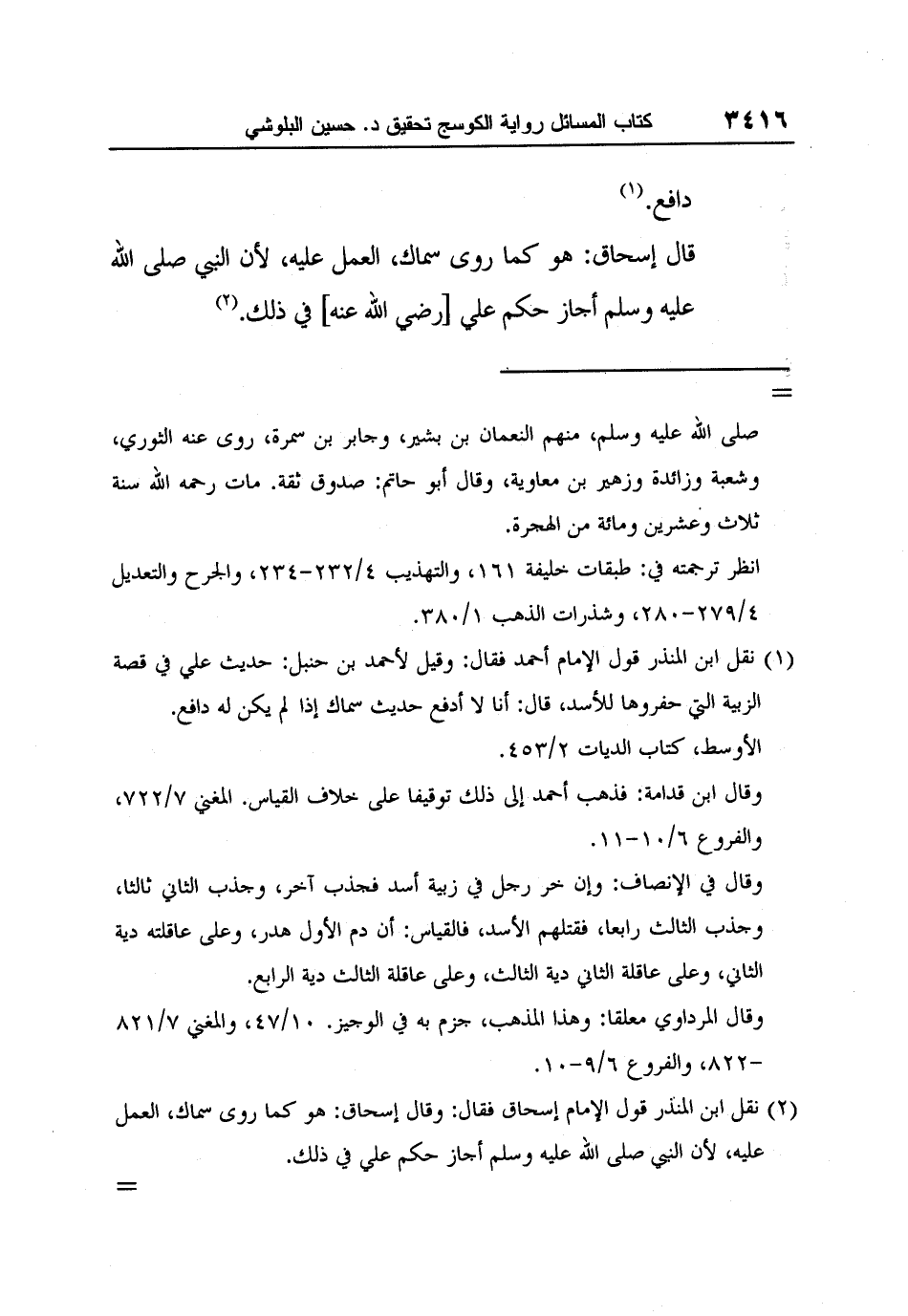 1 نقل ابن المنذر قول الإمام أحمد فقال: وقيل لأحمد بن حنبل: حديث علي في قصة الزبية التي حفروها للأسد، قال: أنا لا أدفع حديث سماك إذا لم يكن له دافع.