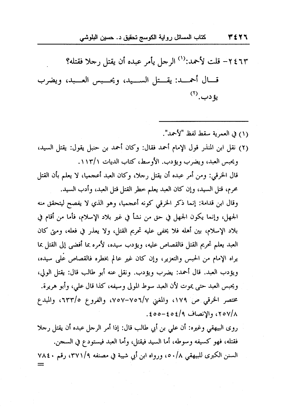 2 نقل ابن المنذر قول الإمام أحمد فقال: وكان أحمد بن حنبل يقول: يقتل السيد، ويحبس العبد، ويضرب ويؤدّب. الأوسط، كتاب الديات 1/113.