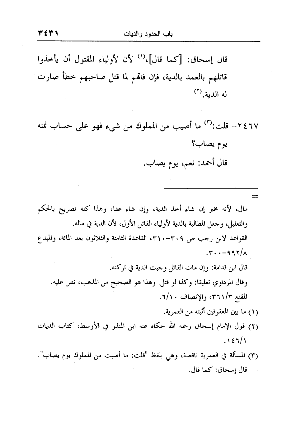 3 المسألة في العمرية ناقصة، وهي بلفظ "قلت: ما أصبت من المملوك يوم يصاب". قال إسحاق: كما قال.