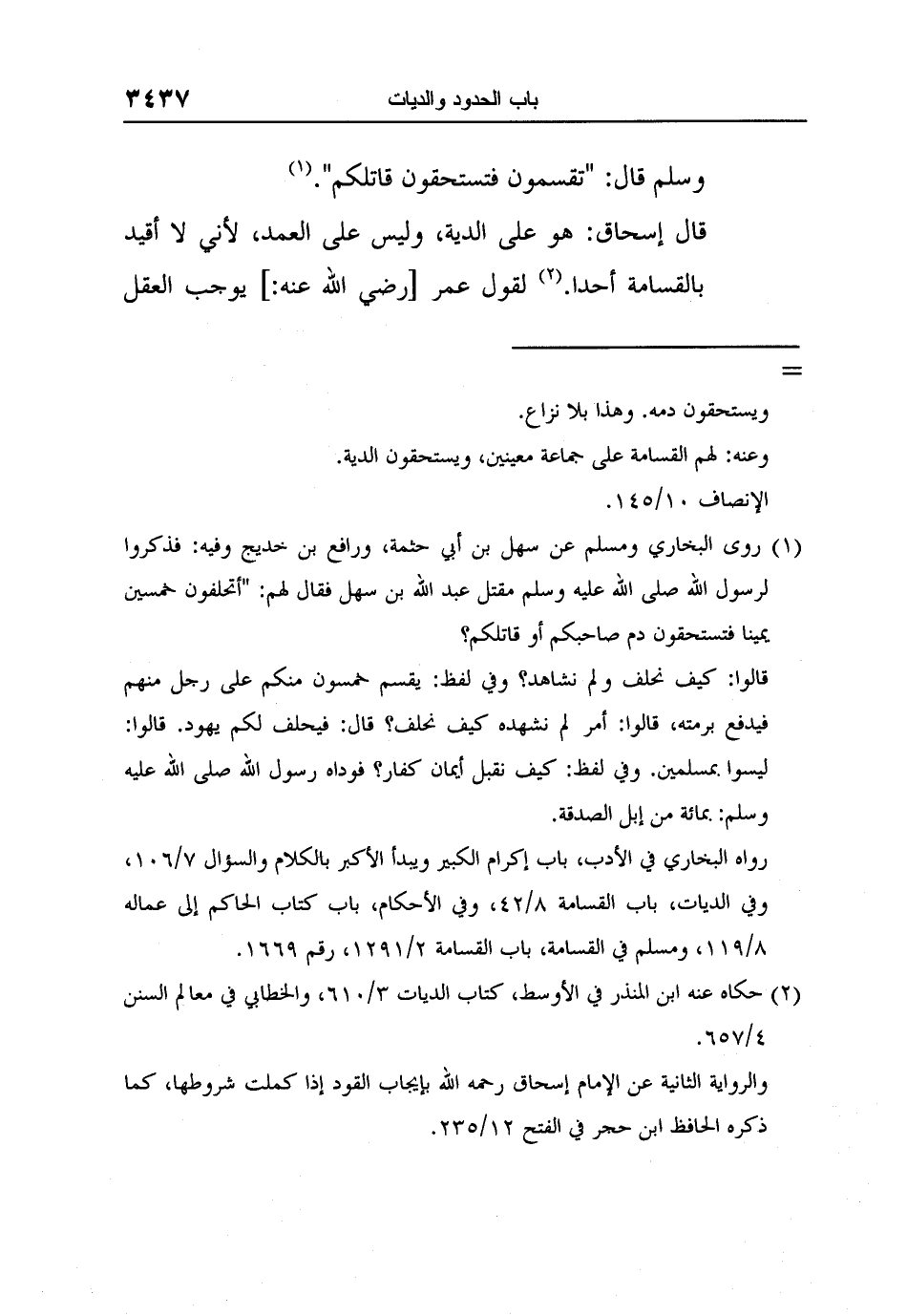 قال إسحاق: هو على الدية، وليس على العمد، لأنّي لا أقيد بالقسامة أحداً. 2 لقول عمر [رضي الله عنه:] يوجب العقل