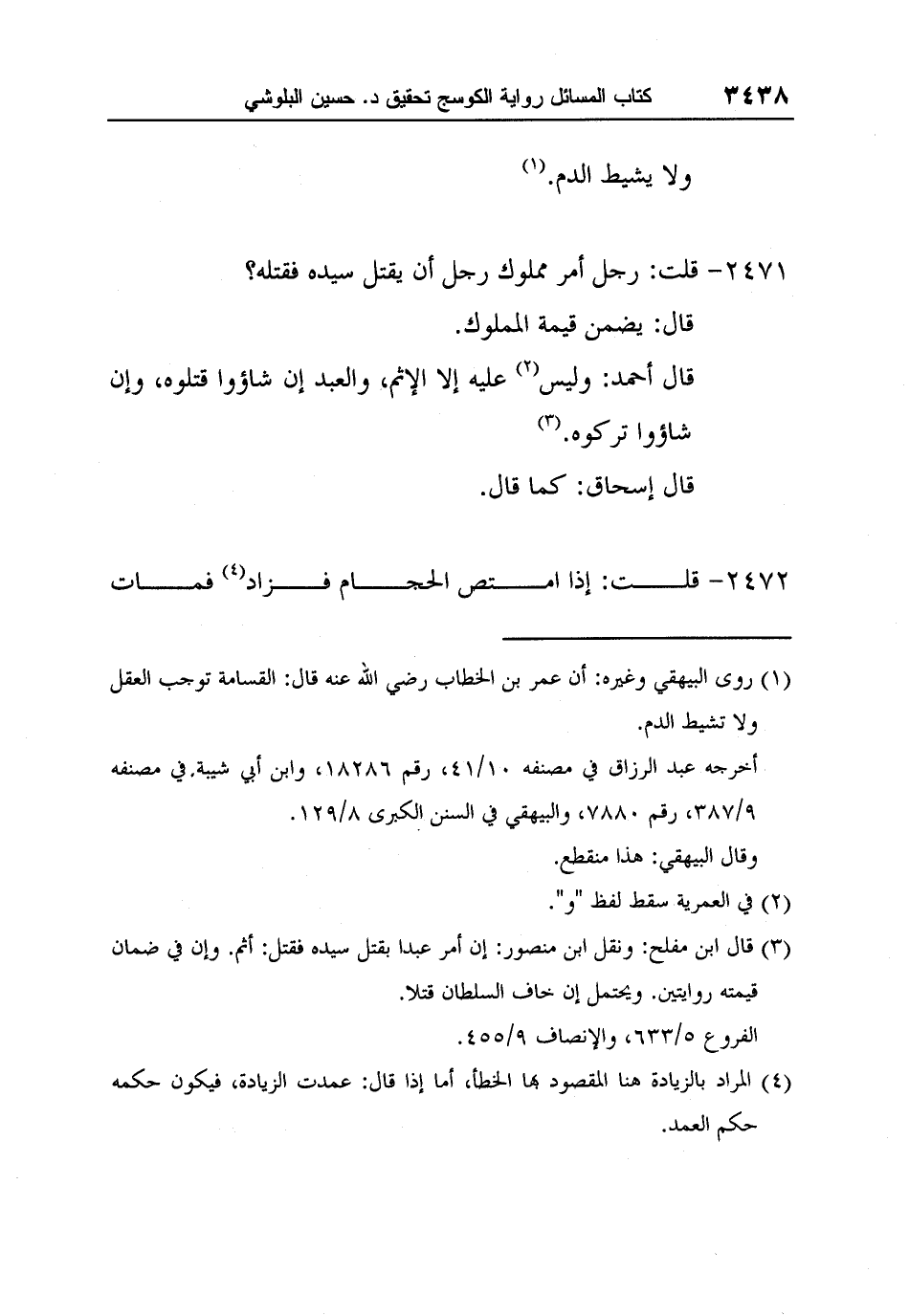 3 قال ابن مفلح: ونقل ابن منصور: إن أمر عبداً بقتل سيده فقتل: أثم. وإن في ضمان قيمته روايتين. ويحتمل إن خاف السلطان قتلا.