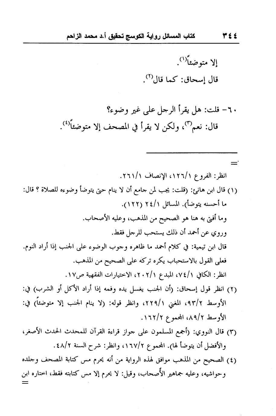 4 الصحيح من المذهب موافق لهذه الرواية من أنه يحرم مس كتابة المصحف وجلده وحواشيه، وعليه جماهير الأًصحاب، وقيل: لا يحرم إلا مس كتابته فقط، اختاره ابن عقيل.
