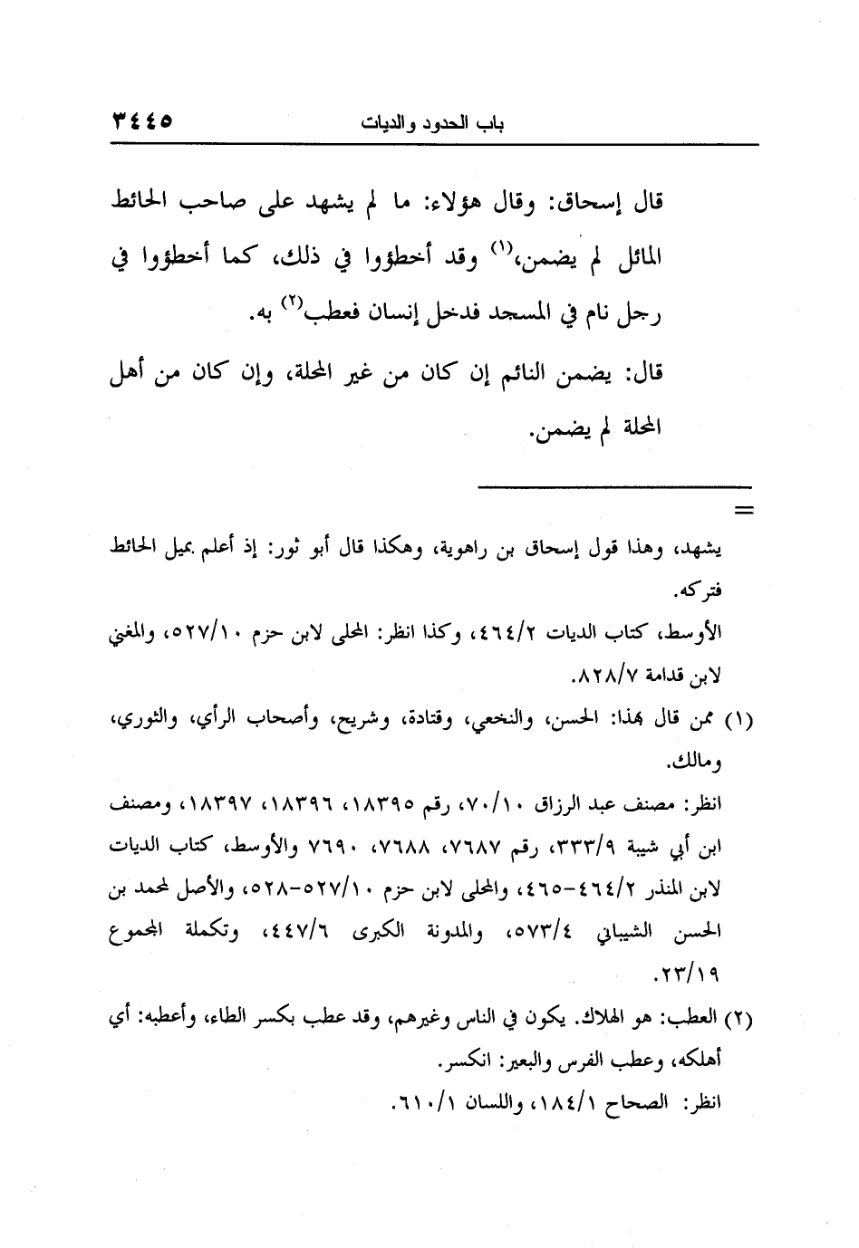 قال إسحاق: وقال هؤلاء: ما لم يشهد على صاحب الحائط المائل لم يضمن، 1 وقد أخطؤوا في ذلك, كما أخطؤوا في رجل نام في المسجد فدخل إنسان فعطب 2 به.