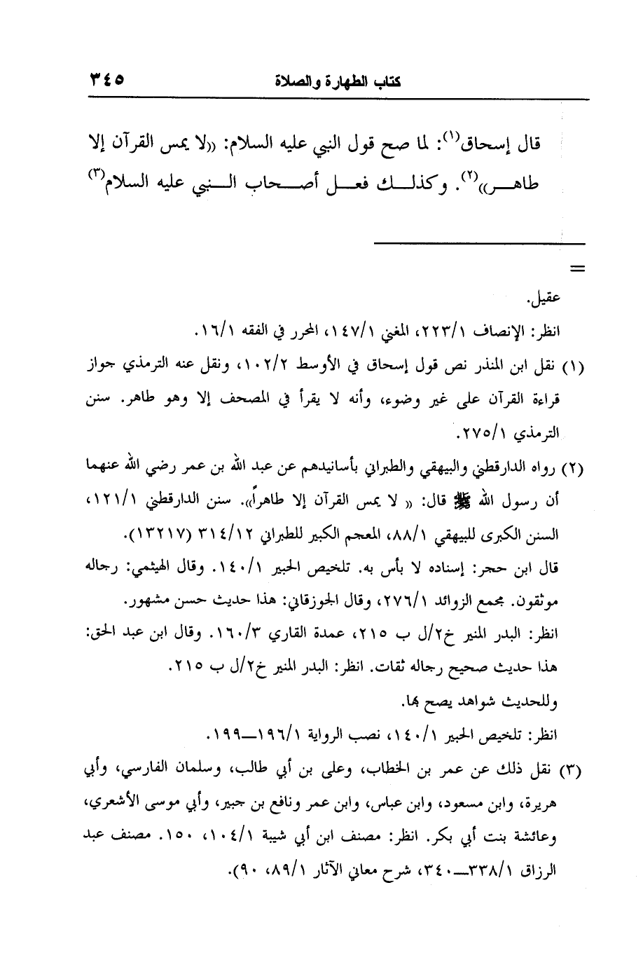 2 رواه الدارقطني والبيهقي والطبراني بأسانيدهم عن عبد الله بن عمر رضي الله عنهما أن رسول الله صلى الله عليه وسلم قال: "لا يمس القرآن إلا طاهراً". سنن الدارقطني 1/121، السنن الكبرى للبيهقي 1/88، المعجم الكبير للطبراني 12/314 (13217) .