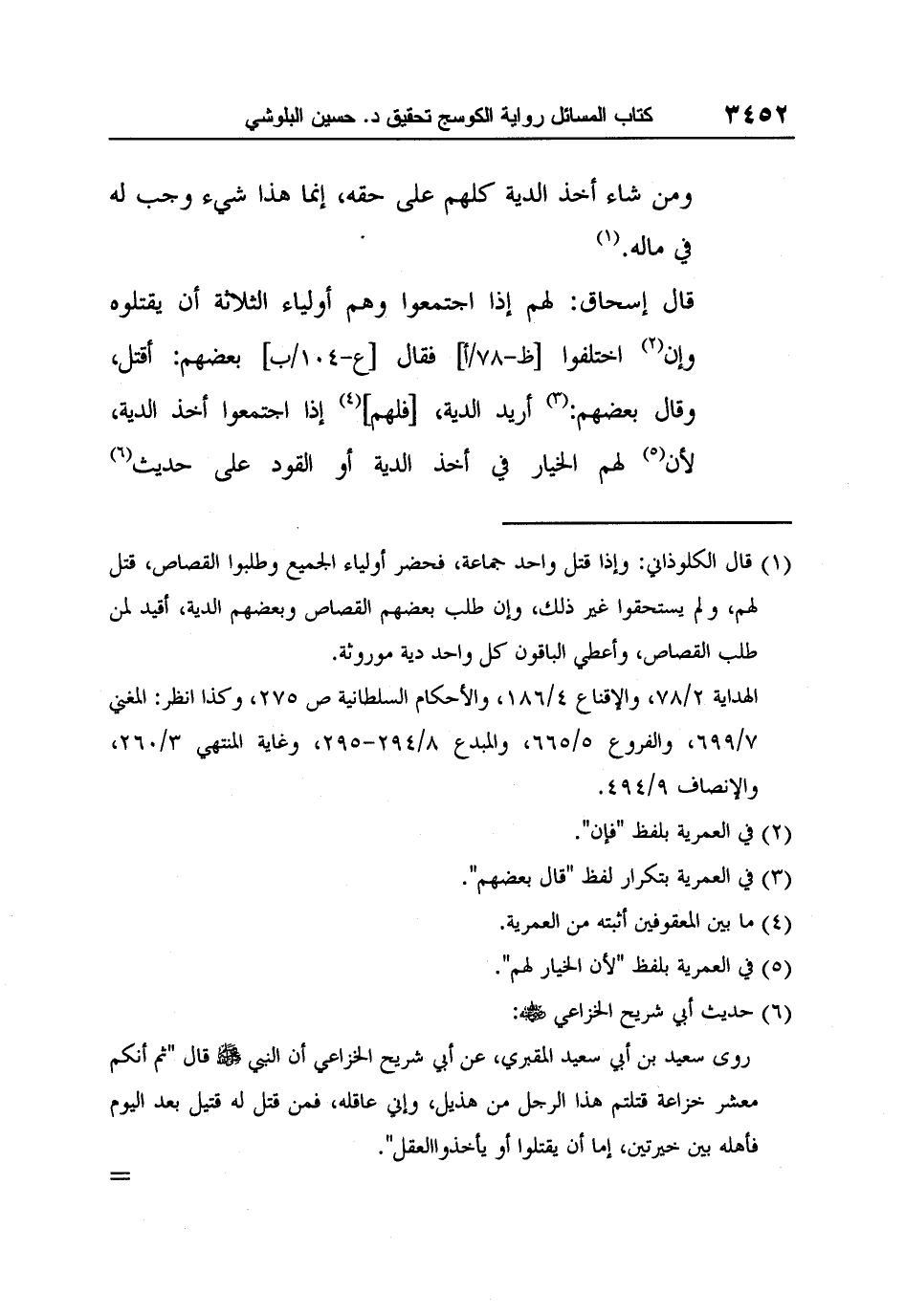 قال إسحاق: لهم إذا اجتمعوا وهم أولياء الثلاثة أن يقتلوه وإن 2 اختلفوا [ظ-78/أ] فقال [ع-104/ب] بعضهم: أقتل, وقال بعضهم: 3 أريد الدية، [فلهم] 4 إذا اجتمعوا أخذ الدية, لأن 5 لهم الخيار في أخذ الدية أو القود على حديث 6