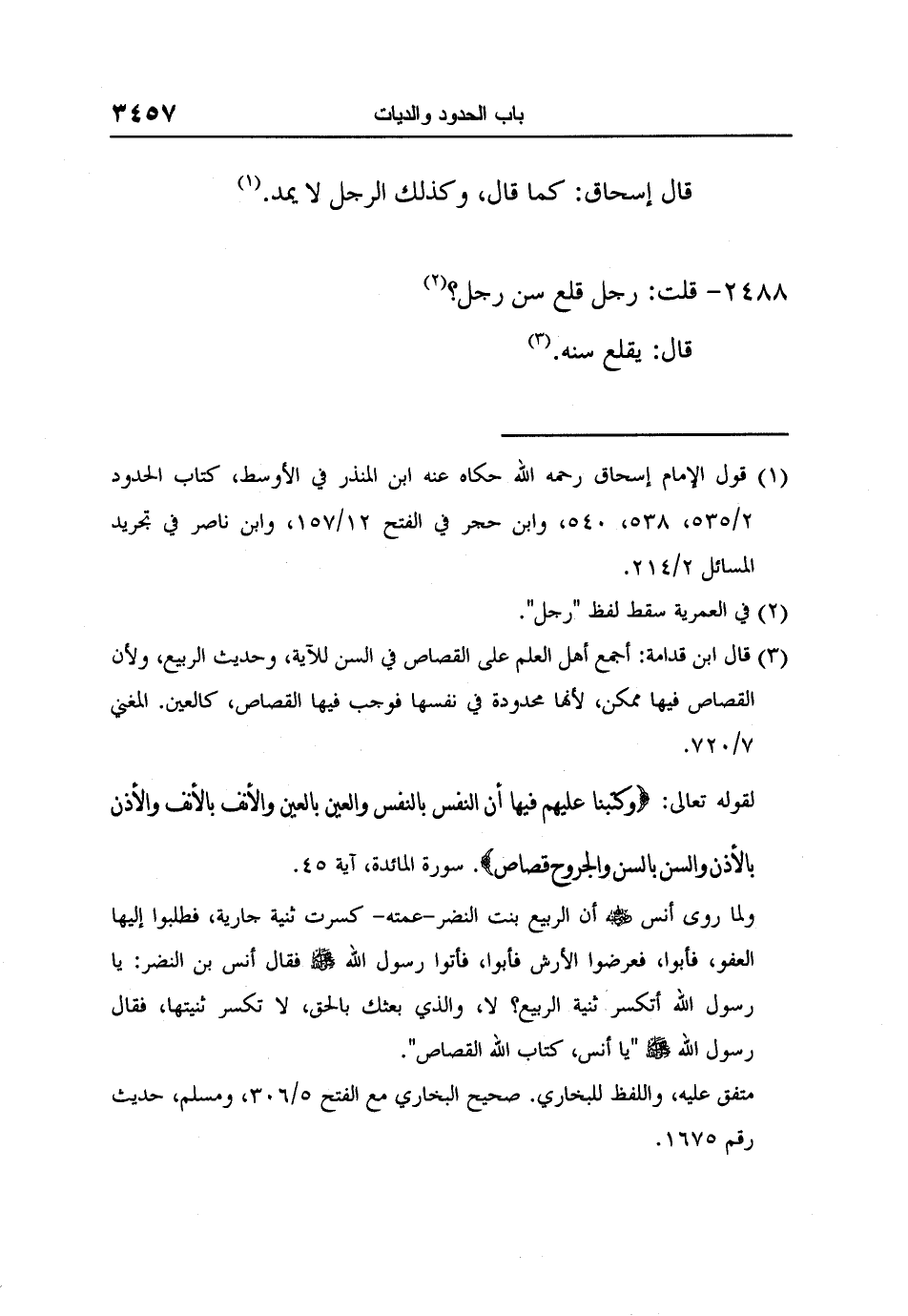 ولما روى أنس رضي الله عنه أن الربيع بنت النضر-عمته- كسرت ثنية جارية، فطلبوا إليها العفو، فأبوا، فعرضوا الأرش فأبوا، فأتوا رسول الله صلى الله عليه وسلم فقال أنس بن النضر: يا رسول الله أتكسر ثنية الربيع؟ لا، والذي بعثك بالحق، لا تكسر ثنيتها، فقال رسول الله صلى الله عليه وسلم "يا أنس، كتاب الله القصاص".