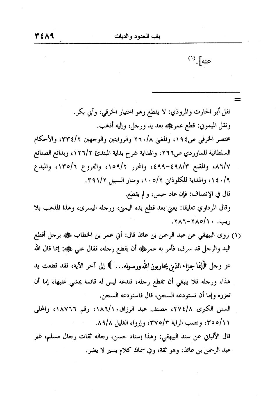 1 روى البيهقي عن عبد الرحمن بن عائذ قال: أتي عمر بن الخطاب رضي الله عنه برجل أقطع اليد والرجل قد سرق، فأمر به عمررضي الله عنه أن يقطع رجله، فقال علي رضي الله عنه: إنما قال الله عز وجل {إِنَّمَا جَزَاءُ الَّذِينَ يُحَارِبُونَ اللَّهَ وَرَسُولَهُ …} إلى آخر الآية، فقد قطعت يد هذا، ورجله فلا ينبغي أن تقطع رجله، فتدعه ليس له قائمة يمشي عليها، إما أن تعزره وإما أن تستودعه السجن، قال فاستودعه السجن.