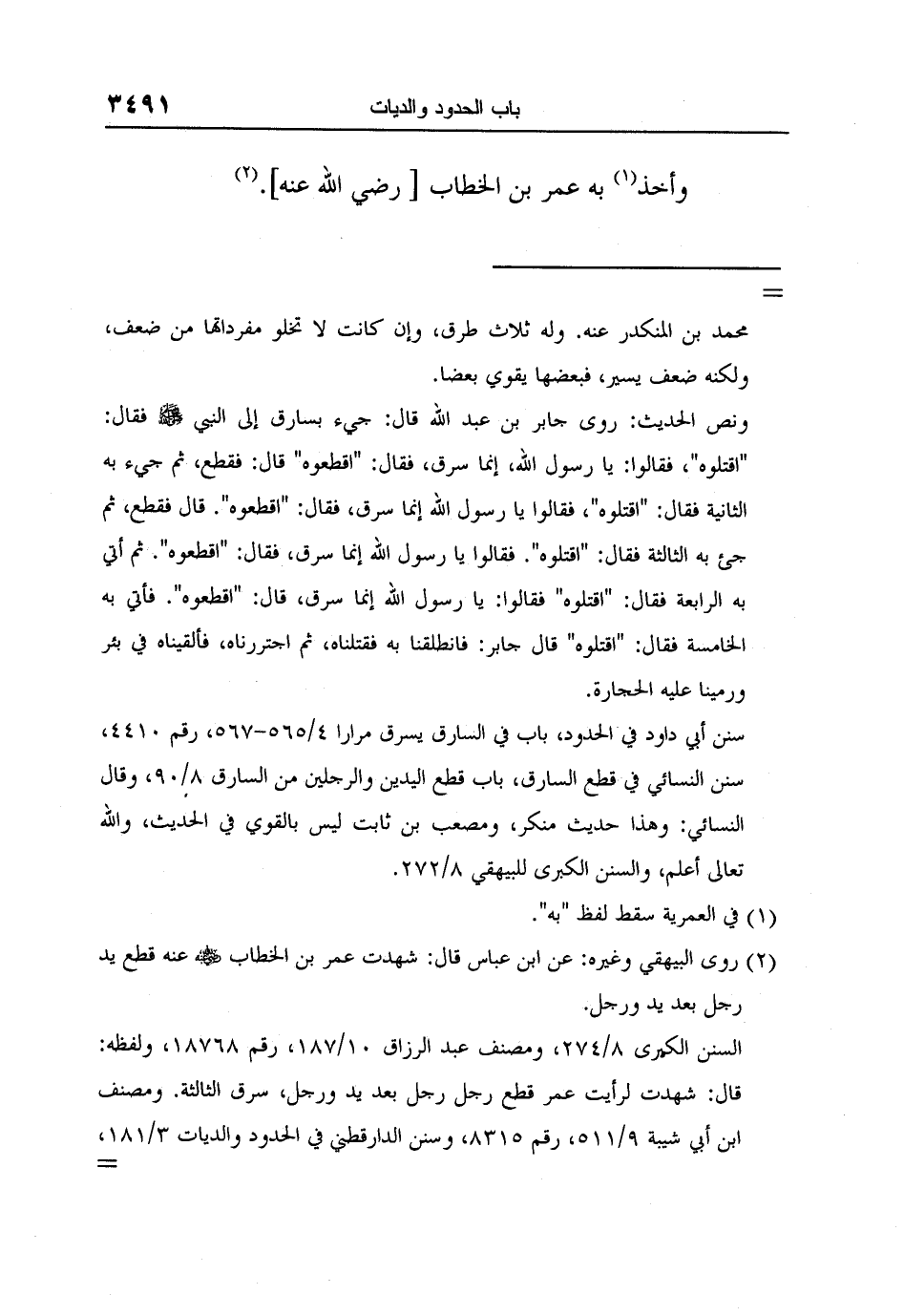 2 روى البيهقي وغيره: عن ابن عباس قال: شهدت عمر بن الخطاب رضي الله عنه عنه قطع يد رجل بعد يد ورجل.