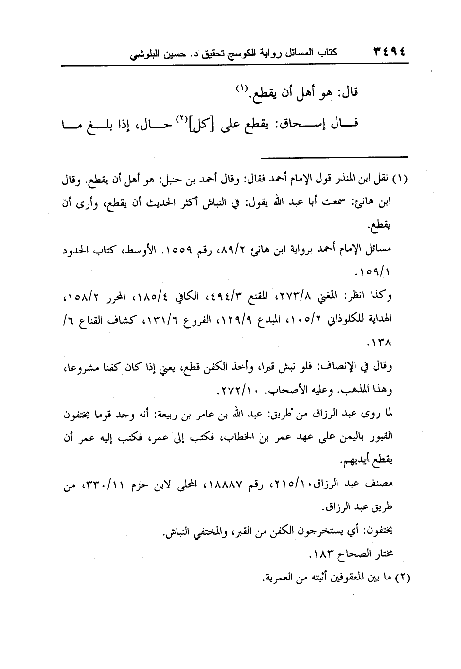 1 نقل ابن المنذر قول الإمام أحمد فقال: وقال أحمد بن حنبل: هو أهل أن يقطع. وقال ابن هانئ: سمعت أبا عبد الله يقول: في النباش أكثر الحديث أن يقطع، وأرى أن يقطع.