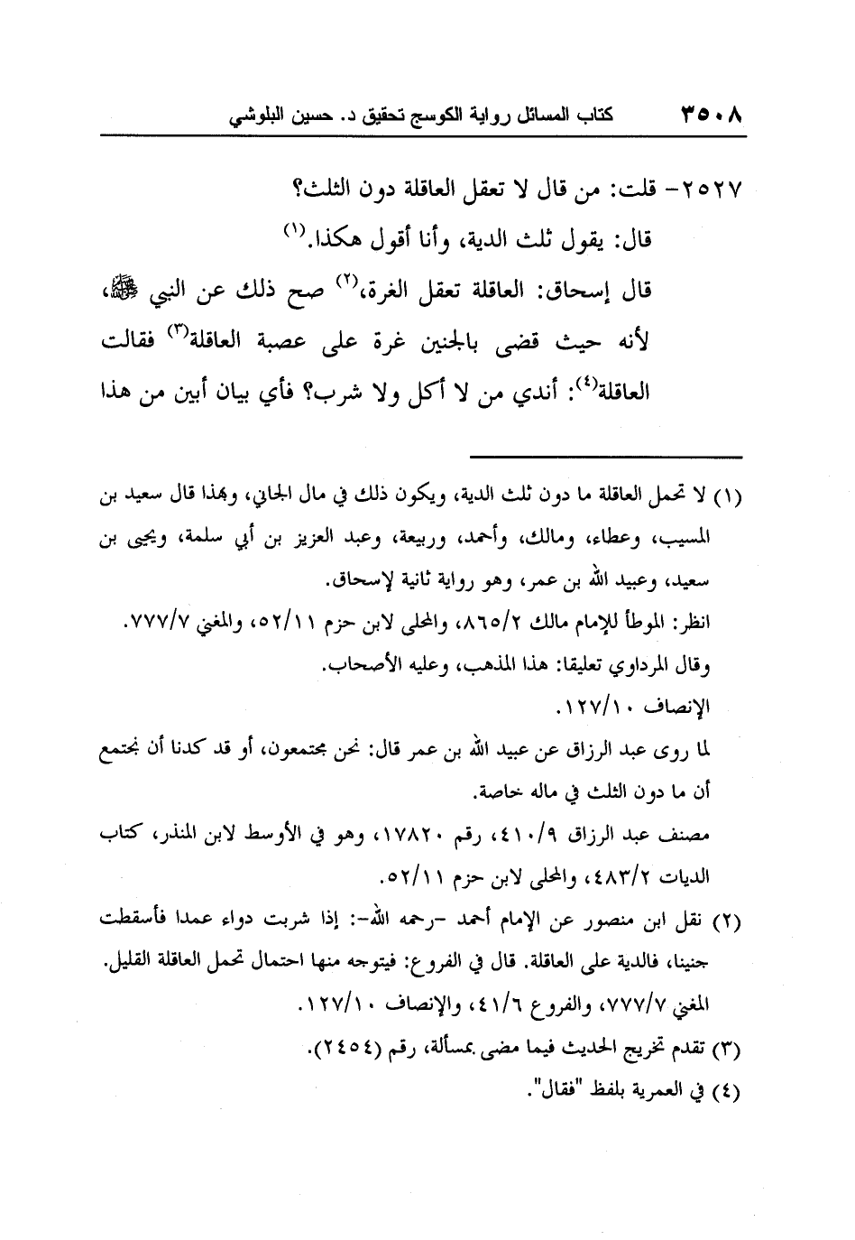 1 لا تحمل العاقلة ما دون ثلث الدية، ويكون ذلك في مال الجاني، وبهذا قال سعيد بن المسيب، وعطاء، ومالك، وأحمد، وربيعة، وعبد العزيز بن أبي سلمة، ويحيى بن سعيد، وعبيد الله بن عمر، وهو رواية ثانية لإسحاق.