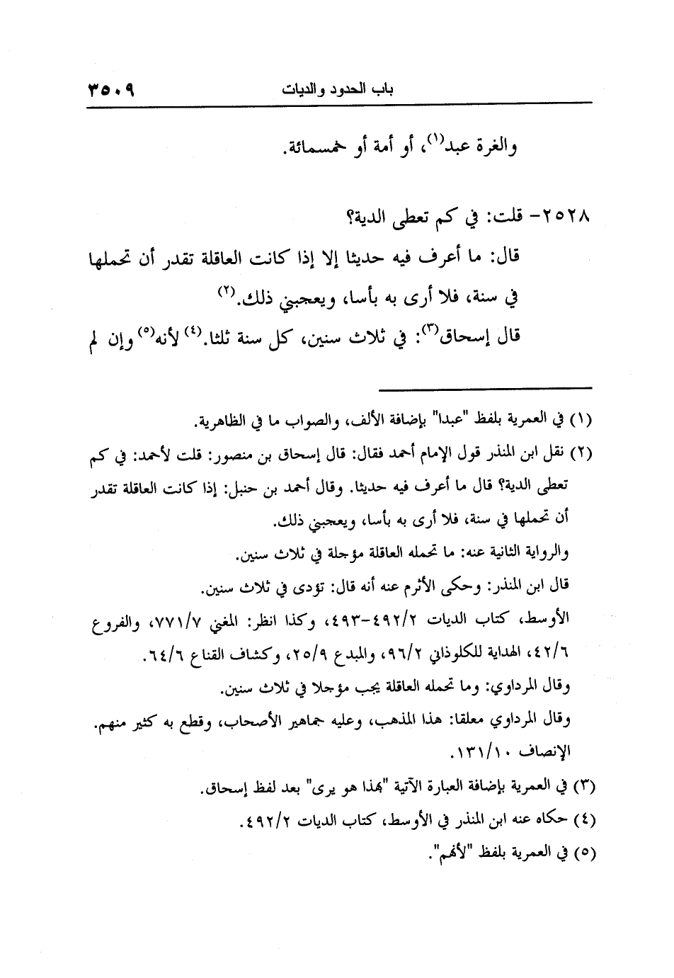 2 نقل ابن المنذر قول الإمام أحمد فقال: قال إسحاق بن منصور: قلت لأحمد: في كم تعطى الدية؟ قال ما أعرف فيه حديثاً. وقال أحمد بن حنبل: إذا كانت العاقلة تقدر أن تحملها في سنة، فلا أرى به بأساً، ويعجبني ذلك.
