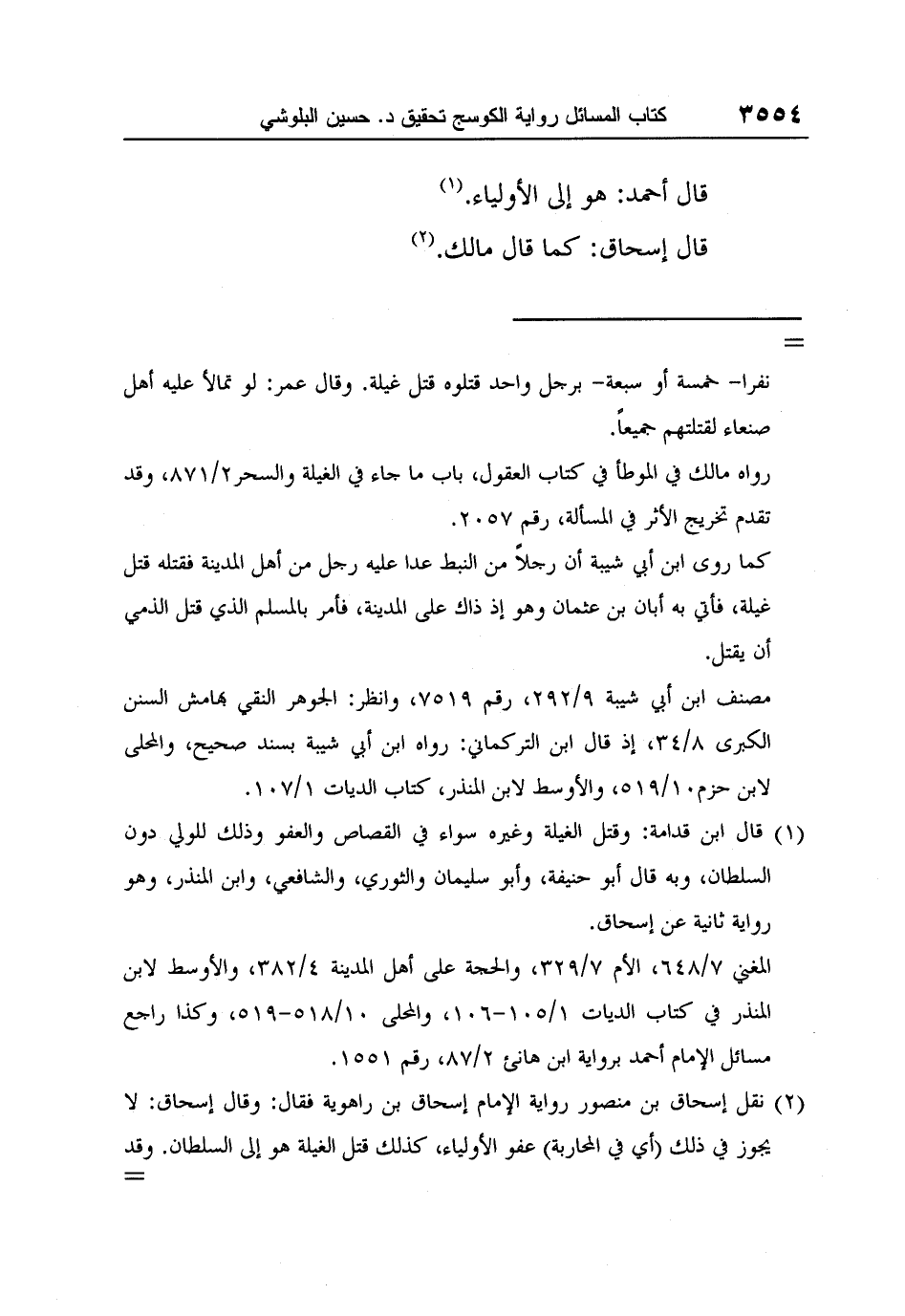2 نقل إسحاق بن منصور رواية الإمام إسحاق بن راهوية فقال: وقال إسحاق: لا يجوز في ذلك (أي في المحاربة) عفو الأولياء، كذلك قتل الغيلة هو إلى السلطان. وقد سبق فيما مضى برقم (2424) .