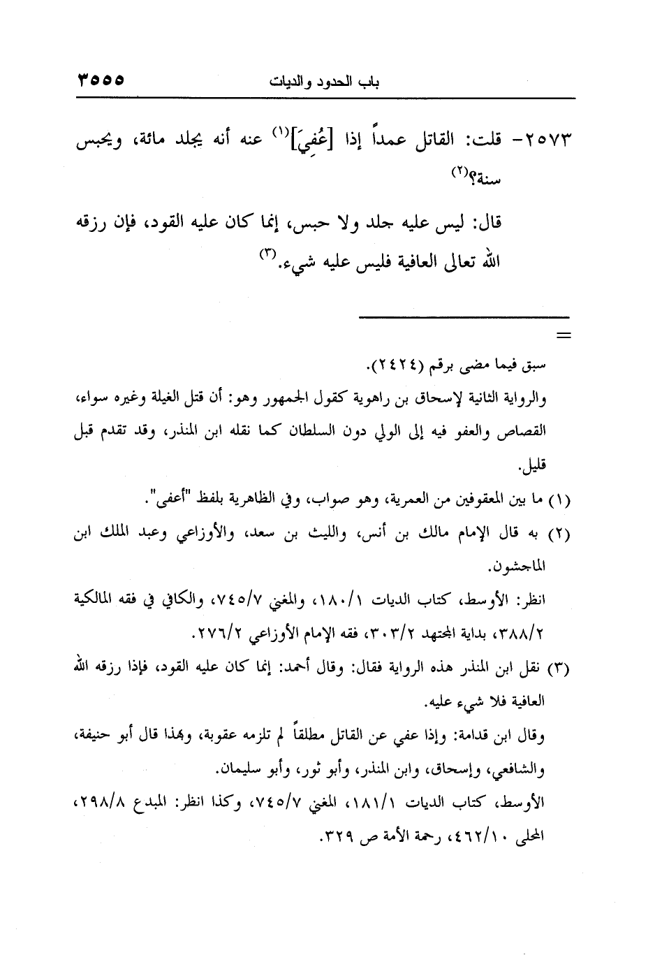 [2573-] قلت: القاتل عمداً إذا [عُفِيَ] 1 عنه أنه يجلد مائة، ويحبس سنة؟ 2