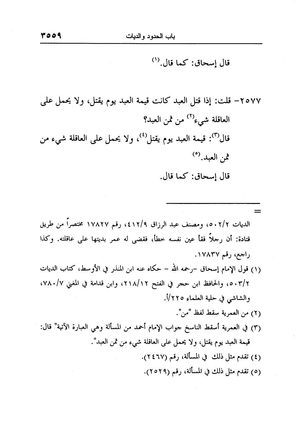 3 في العمرية أسقط الناسخ جواب الإمام أحمد من المسألة وهي العبارة الآتية" قال: قيمة العبد يوم يقتل، ولا يحمل على العاقلة شيء من ثمن العبد".