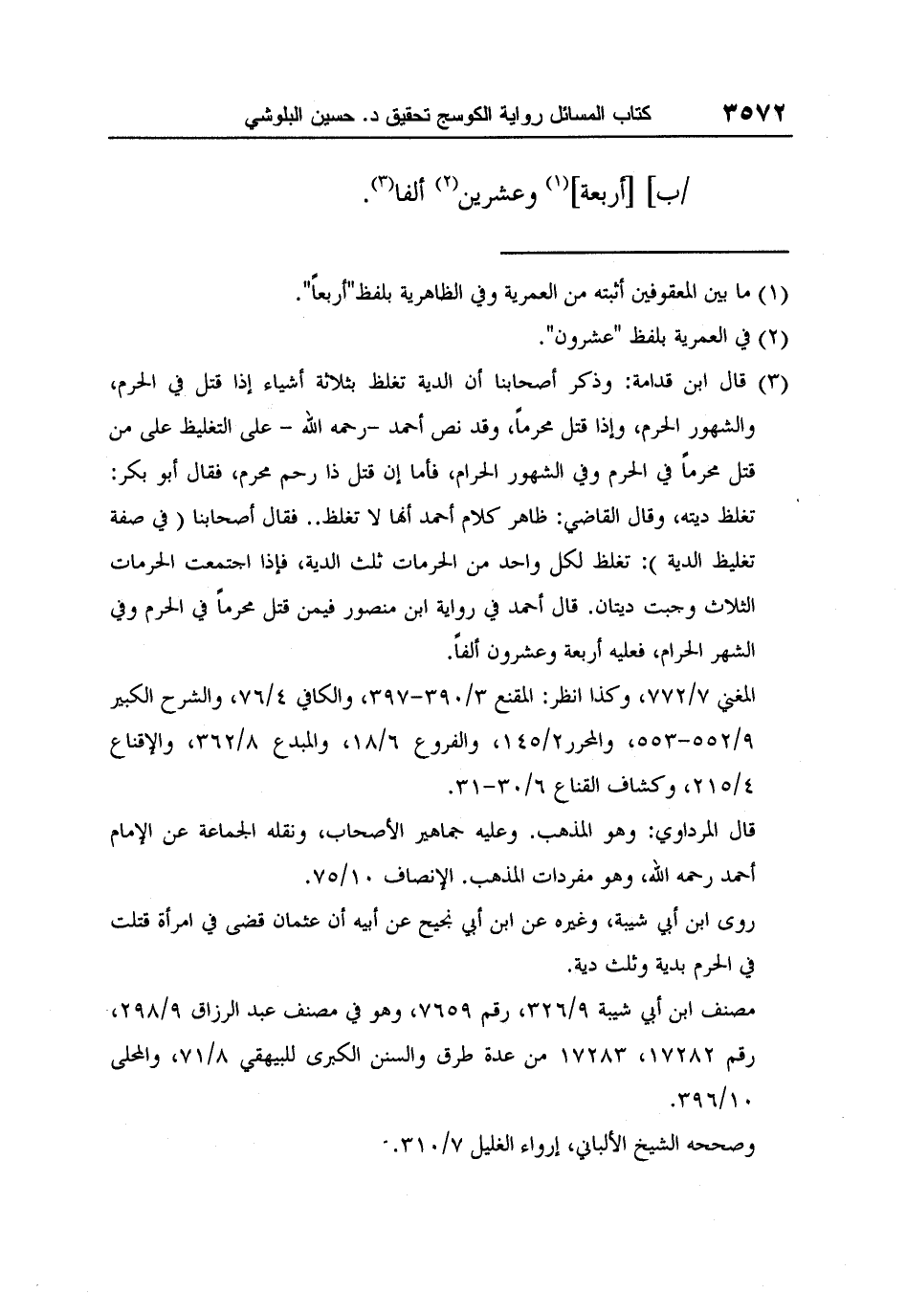 3 قال ابن قدامة: وذكر أصحابنا أن الدية تغلظ بثلاثة أشياء إذا قتل في الحرم، والشهور الحرم، وإذا قتل محرماً، وقد نص أحمد -رحمه الله - على التغليظ على من قتل محرماً في الحرم وفي الشهور الحرام، فأما إن قتل ذا رحم محرم، فقال أبو بكر: تغلظ ديته، وقال القاضي: ظاهر كلام أحمد أنها لا تغلظ.. فقال أصحابنا (في صفة تغليظ الدية) : تغلظ لكل واحد من الحرمات ثلث الدية، فإذا اجتمعت الحرمات الثلاث وجبت ديتان. قال أحمد في رواية ابن منصور فيمن قتل محرماً في الحرم وفي الشهر الحرام، فعليه أربعة وعشرون ألفاً.