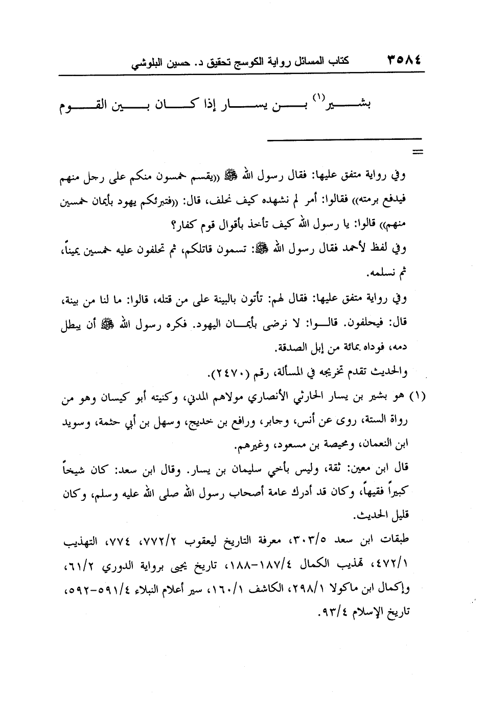 1 هو بشير بن يسار الحارثي الأنصاري مولاهم المدني، وكنيته أبو كيسان وهو من رواة الستة، روى عن أنس، وجابر، ورافع بن خديج، وسهل بن أبي حثمة، وسويد ابن النعمان، ومحيصة بن مسعود، وغيرهم.
