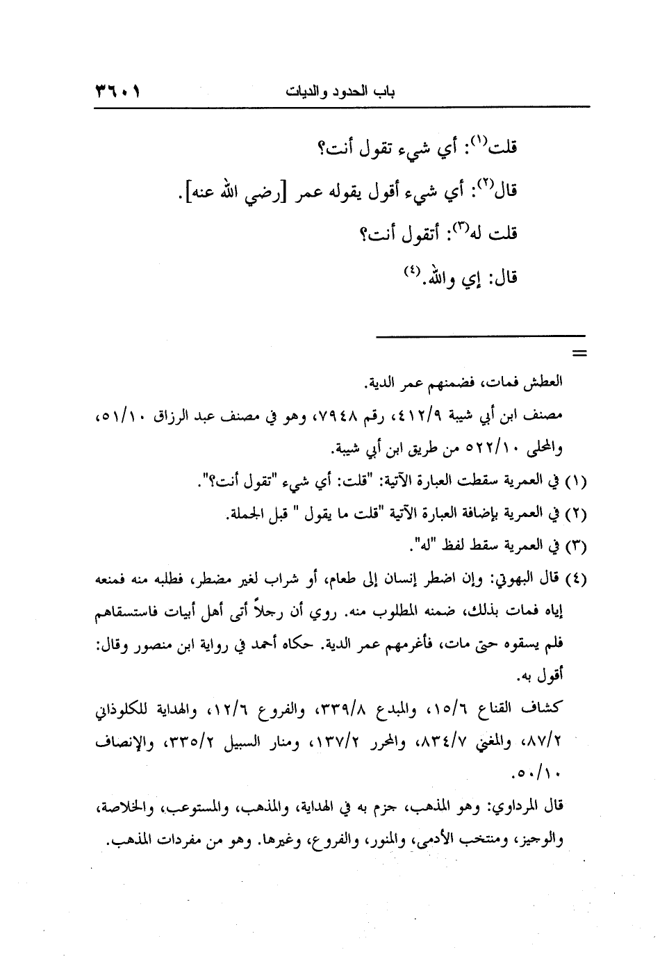 4 قال البهوتي: وإن اضطر إنسان إلى طعام، أو شراب لغير مضطر، فطلبه منه فمنعه إياه فمات بذلك، ضمنه المطلوب منه. روي أن رجلاً أتى أهل أبيات فاستسقاهم فلم يسقوه حتى مات، فأغرمهم عمر الدية. حكاه أحمد في رواية ابن منصور وقال: أقول به.
