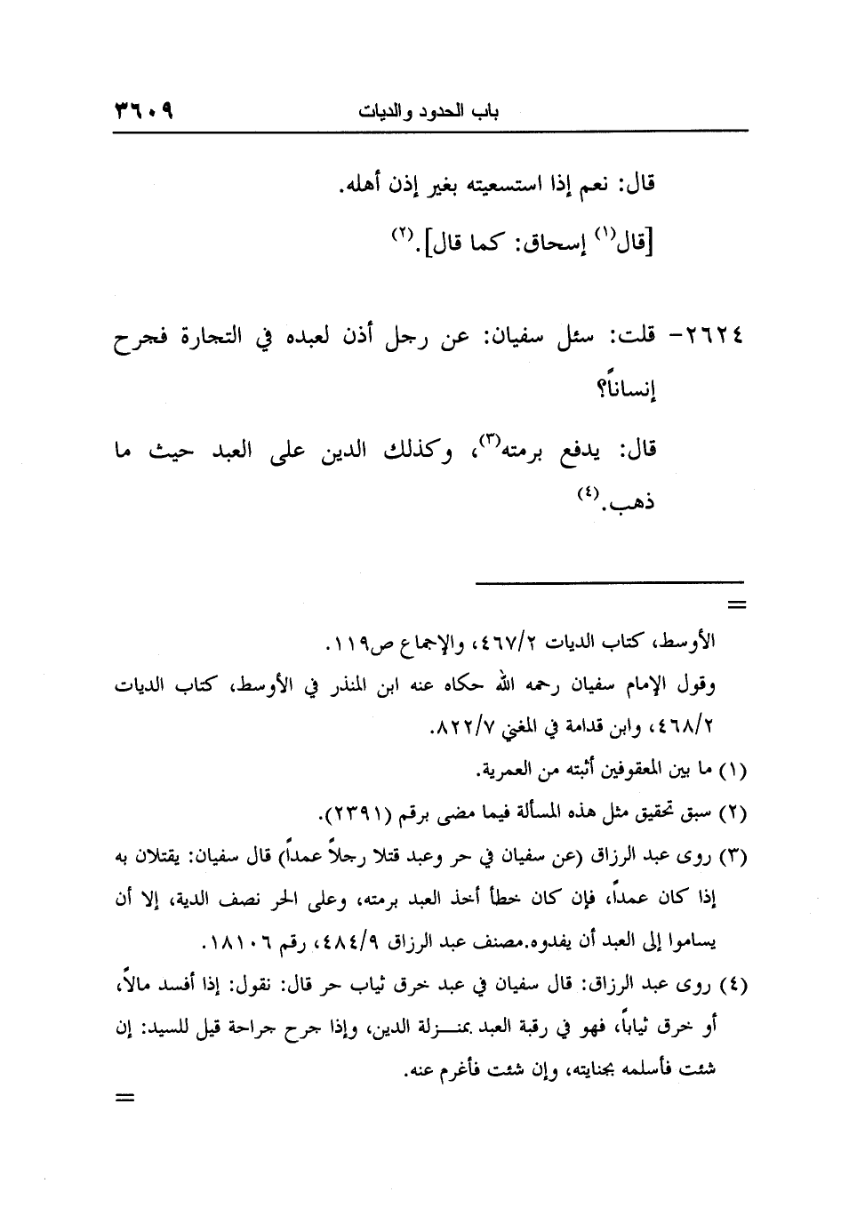 [2624-] قلت: سئل سفيان: عن رجل أذن لعبده في التجارة فجرح إنساناً؟