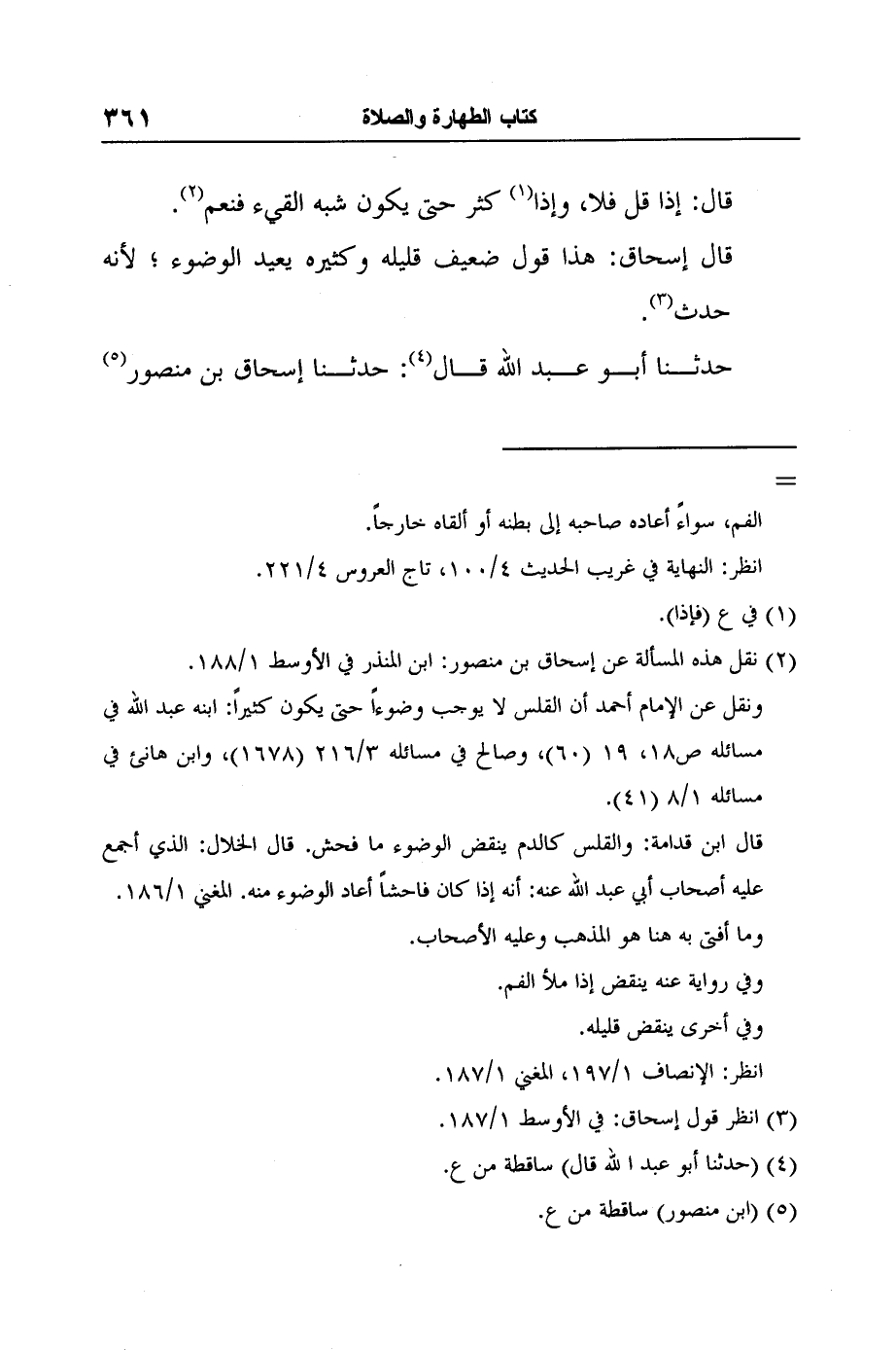 ونقل عن الإمام أحمد أن القلس لا يوجب وضوءاً حتى يكون كثيراً: ابنه عبد الله في مسائله ص18، 19 (60) ، وصالح في مسائله 3/216 (1678) ، وابن هانئ في مسائله 1/8 (41) .
