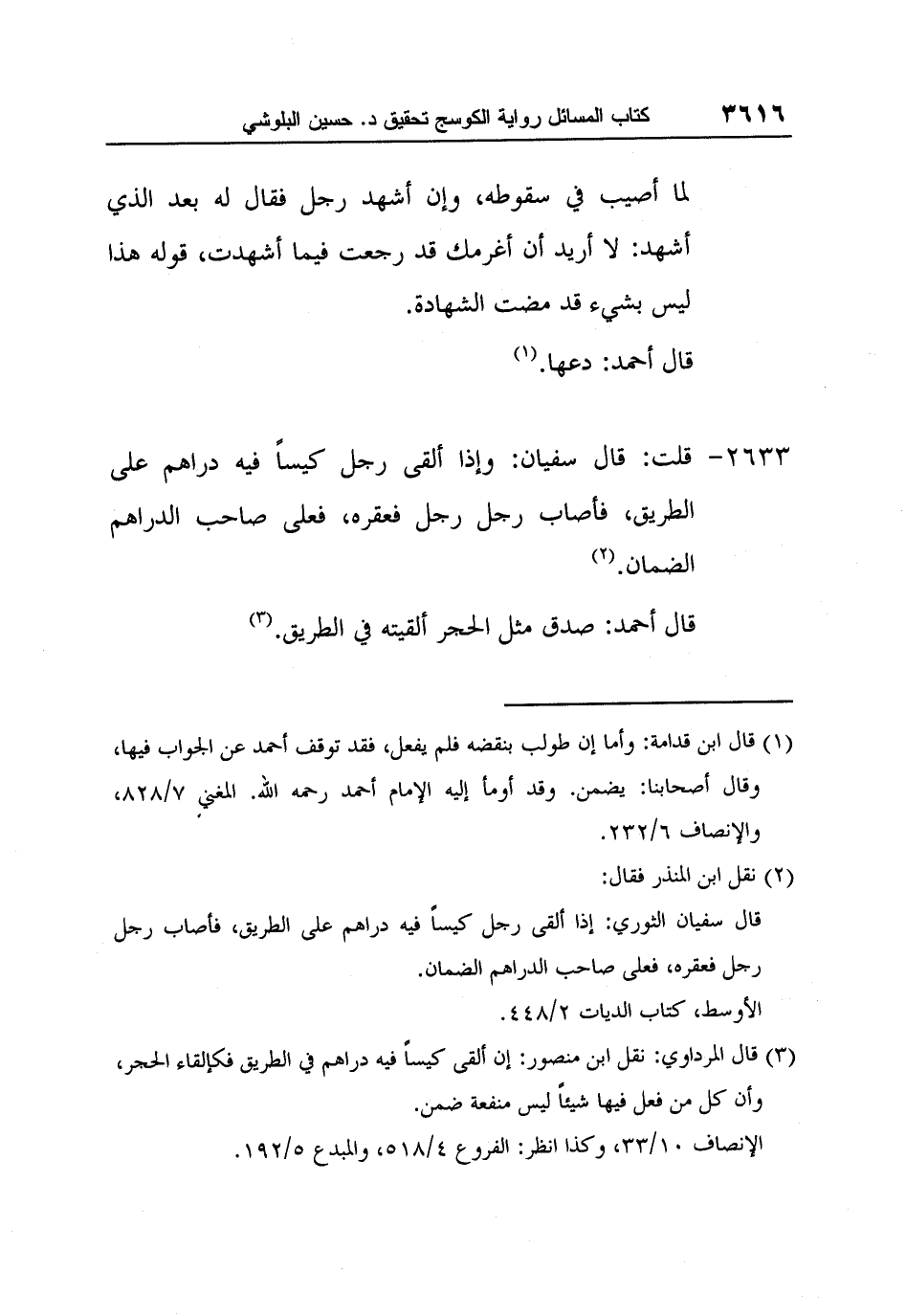 [2633-] قلت: قال سفيان: وإذا ألقى رجل كيساً فيه دراهم على الطريق، فأصاب رجل رجل فعقره، فعلى صاحب الدراهم الضمان. 2