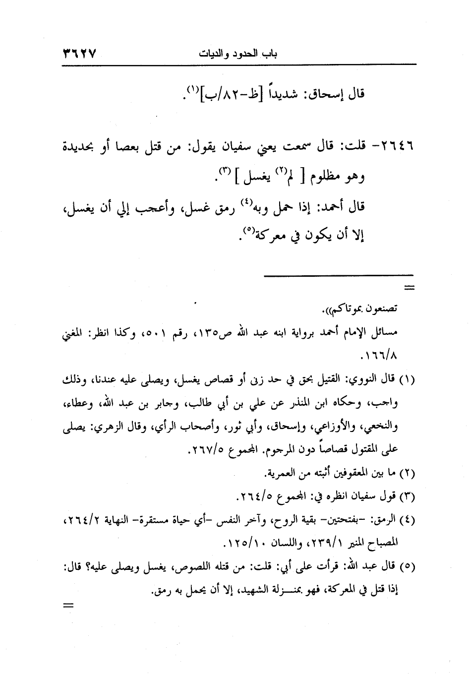 [2646-] قلت: قال سمعت يعني سفيان يقول: من قتل بعصا أو بحديدة وهو مظلوم [لم 2 يغسل] 3.
