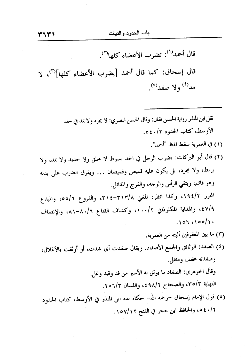 2 قال أبو البركات: يضرب الرجل في الحد بسوط لا خلق ولا حديد ولا يمد، ولا يربط، ولا يجرد، بل يكون عليه قميص وقميصان … ويفرق الضرب على بدنه وهو قائم، ويتقي الرأس والوجه، والفرج والمقاتل.