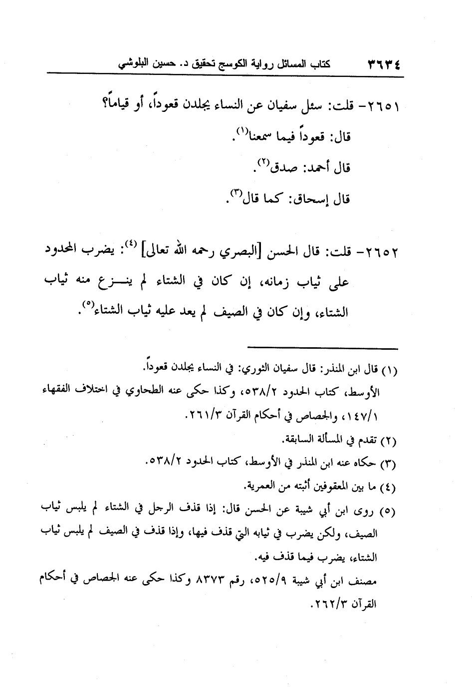 [2651-] قلت: سئل سفيان عن النساء يجلدن قعوداً، أو قياماً؟