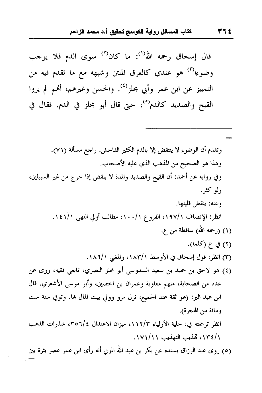5 روى عبد الرزاق بسنده عن بكر بن عبد الله المزني أنه رأى ابن عمر عصر بثرة بين عينيه فخرج منها شيء ففته بين أصبعيه، ثم صلى ولم يتوضأ. المصنف 1/145، ورواه ابن أبي شيبة في مصنفه 1/138، ورواه البيهقي في السنن الكبرى 1/141. وروى ابن أبي شيبة بسنده عن أبي مجلز أنه كان لا يرى القيح شيئاً. قال: إنما ذكر الله الدم. المصنف 1/116، 117.