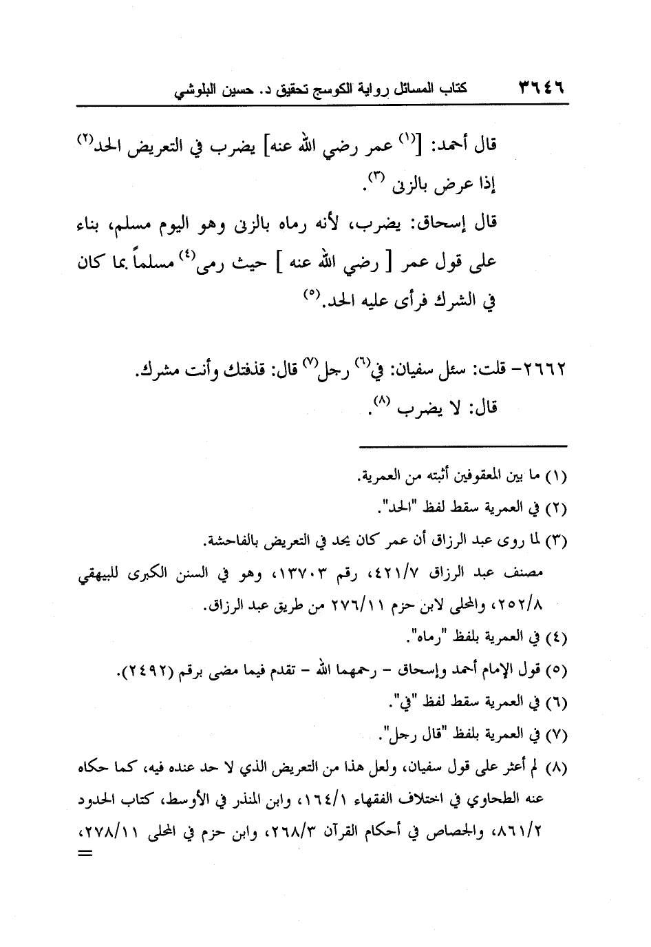 8 لم أعثر على قول سفيان، ولعل هذا من التعريض الذي لا حد عنده فيه، كما حكاه عنه الطحاوي في اختلاف الفقهاء 1/164، وابن المنذر في الأوسط، كتاب الحدود 2/861، والجصاص في أحكام القرآن 3/268، وابن حزم في المحلى 11/278، وابن قدامة في المغني 8/222.
