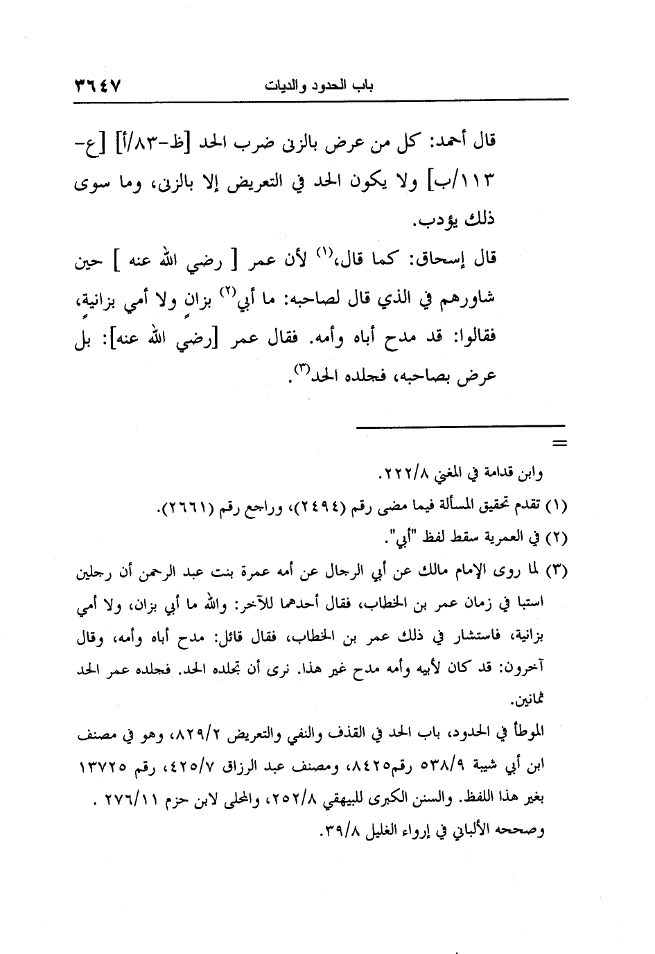 قال إسحاق: كما قال، 1 لأن عمر [رضي الله عنه] حين شاورهم في الذي قال لصاحبه: ما أبي 2 بزانٍ ولا أمي بزانيةٍ، فقالوا: قد مدح أباه وأمه. فقال عمر [رضي الله عنه] : بل عرض بصاحبه، فجلده الحد 3.
