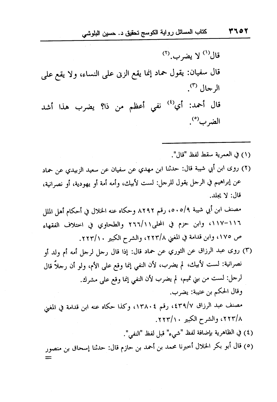 5 قال أبو بكر الخلال أخبرنا محمد بن أحمد بن حازم قال: حدثنا إسحاق بن منصور أنه قال لأبي عبد الله: قال إبراهيم في الرجل يقول للرجل العربي وأمه أمة، أو يهودية، أو نصرانية: لست لأبيك، لا يضرب.
